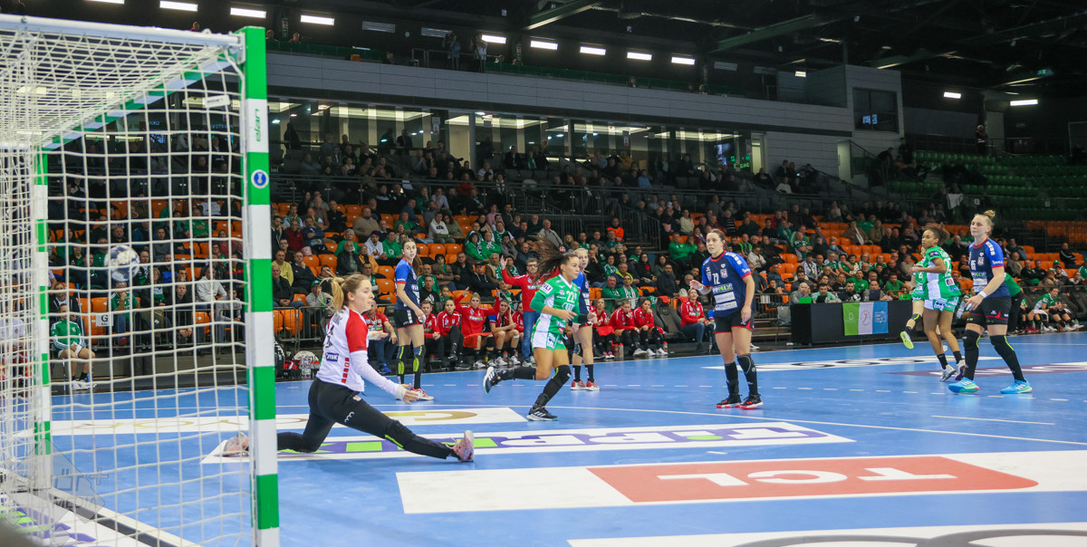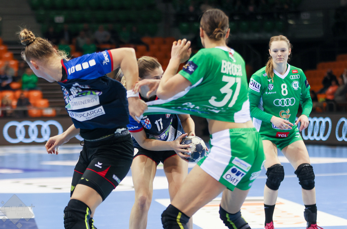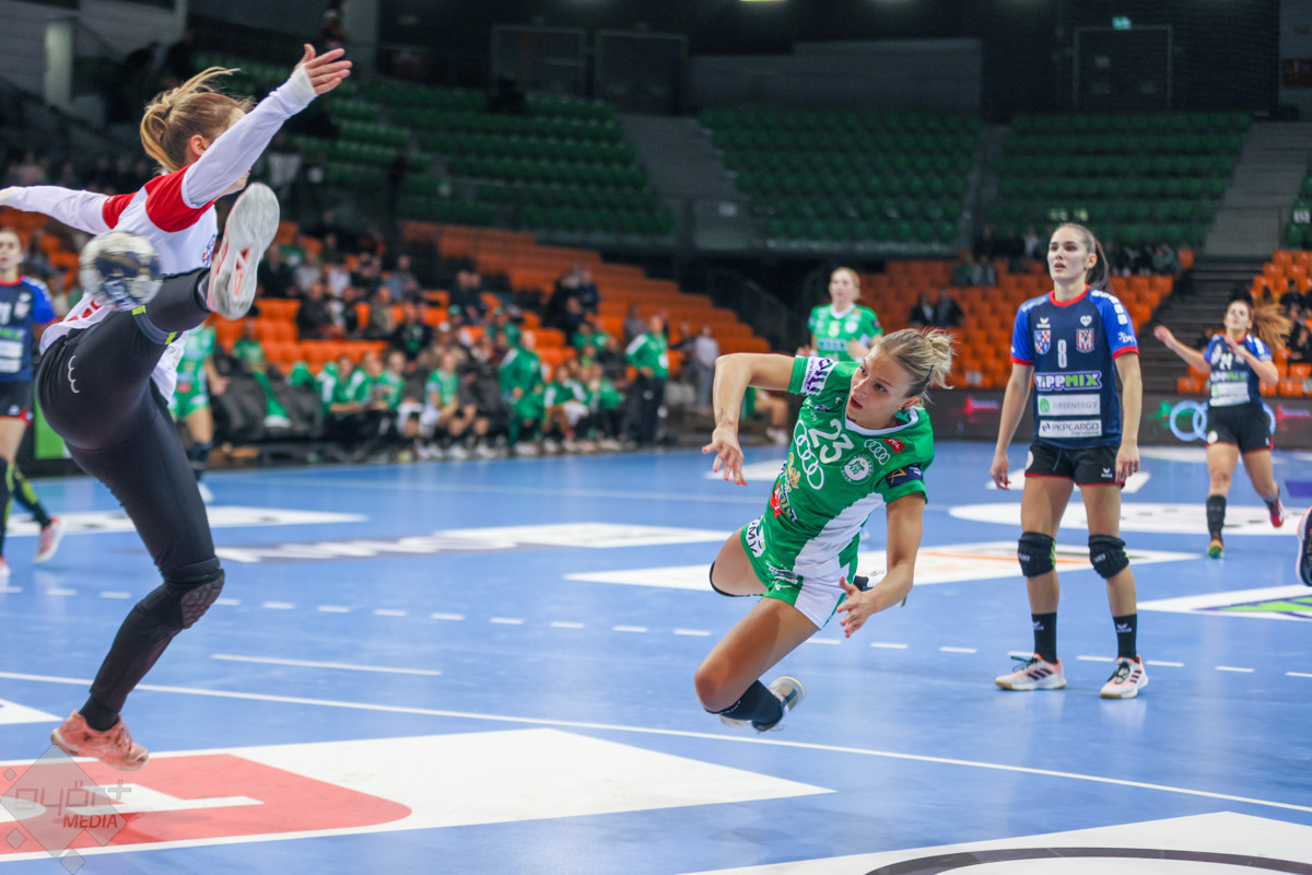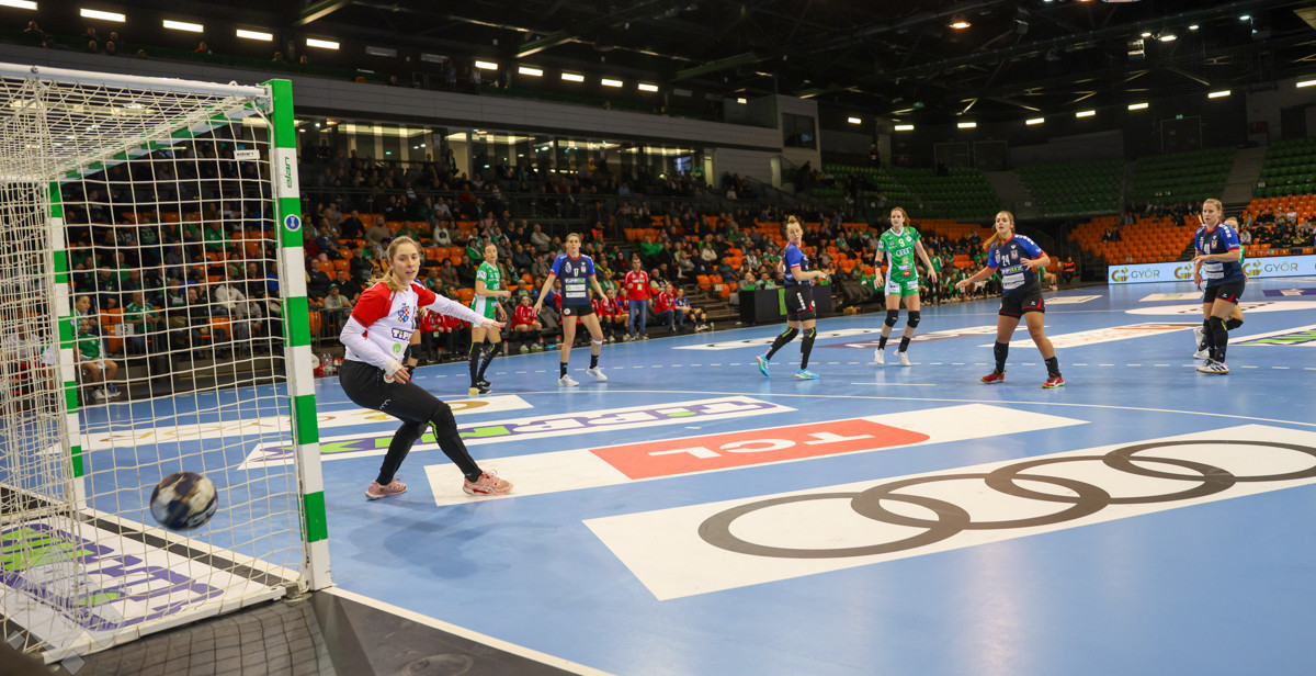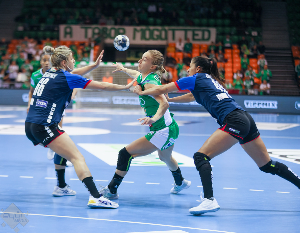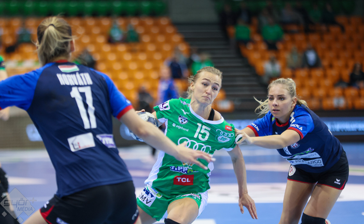 Ambros Martín vezetőedző a Faluvégi, Gros, Oftedal, Broch, Nze Minko, Schatzl hatossal és Tofttal a kapuban kezdte meg a mérkőzést. A találkozó első két gólját ugyan a vendégek szerezték, de egy 7 – 0-ás sorozatnak köszönhetően 7 – 2-re vezetett a győri csapat a tizedik percben. Sandra Toft védéseinek és a gyors lerohanásoknak köszönhetően a 18. percben már tíz góllal vezetett a csapat (13 – 3). A félidő utolsó tíz percére tizenhárom gólos győri előnnyel fordultak a csapatok (16 – 3). A győri kapuban hitetlen formában védett Sandra Toft, aki a 26. percben 75%-os hatékonysággal hárította a vendégek lövéseit. Az első félidő végül 22 – 7-es győri vezetéssel zárult.