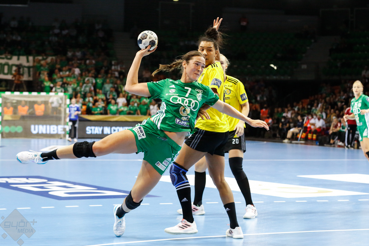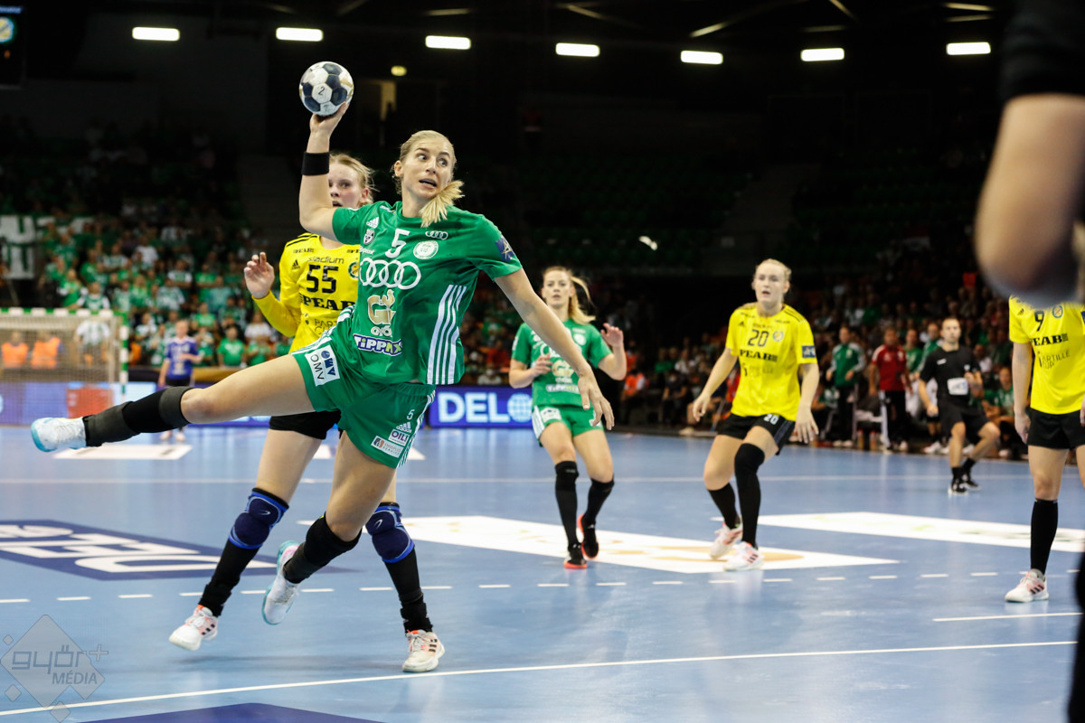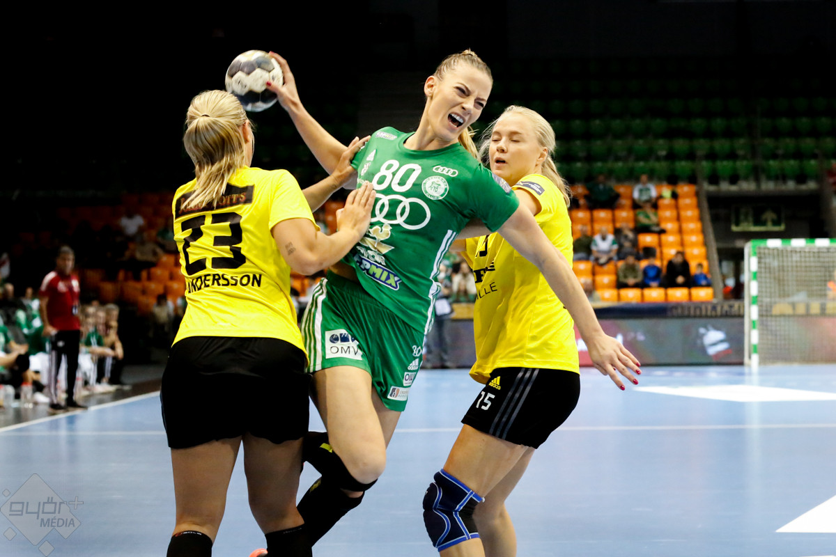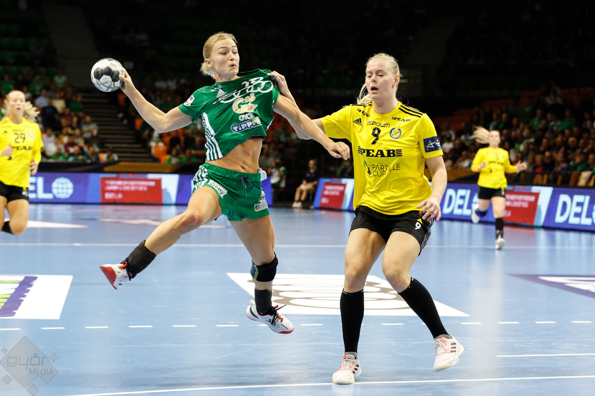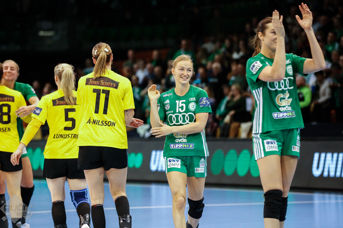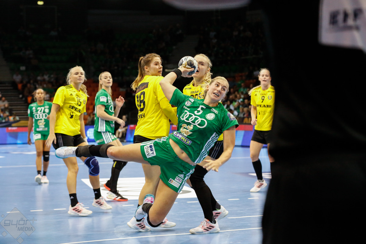 A mérkőzés keretéből Faluvégi Dorottya, Crina Pintea és Veronica Kristiansen maradt ki. Ambros Martín a Schatzl, Háfra, Oftedal, Brattset, Ryu, Lukács hatossal és Leynauddal a kapuban kezdett. Az első gólt a vendégek szerezték, de az ötödik percben már két góllal vezettek Lukácsék (3 – 1). Remekül működött a győri csapat védekezése, és a 12. percben már öt volt az előnye a svédekkel szemben (9 – 4). A félidő utolsó tíz percére hat gólos győri vezetéssel fordultak a csapatok (12 – 6). A közönség fantasztikus megoldásoknak tapsolhatott, a magabiztosan játszó hazai csapat Amandine Leynaud védéseinek, a kőkemény védekezésnek és a gyors támadásbefejezéseknek is köszönhetően az első játékrészt 20 – 9-es győri vezetéssel zárta.