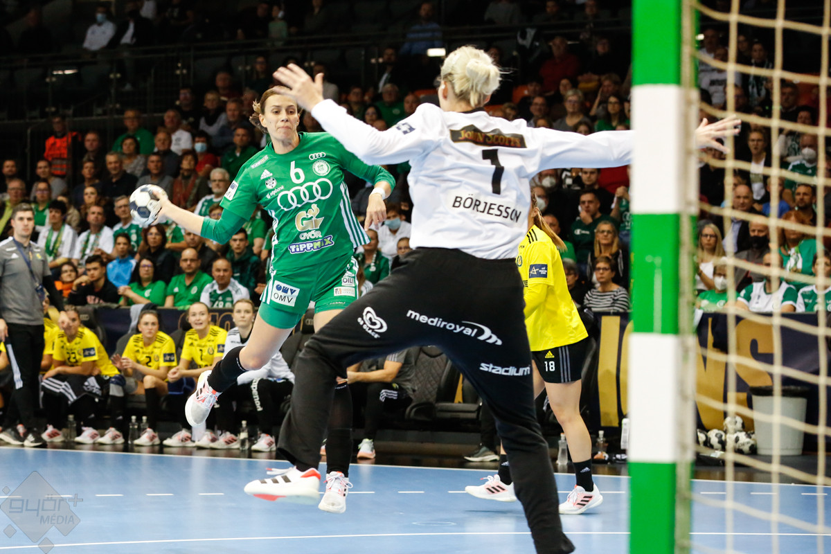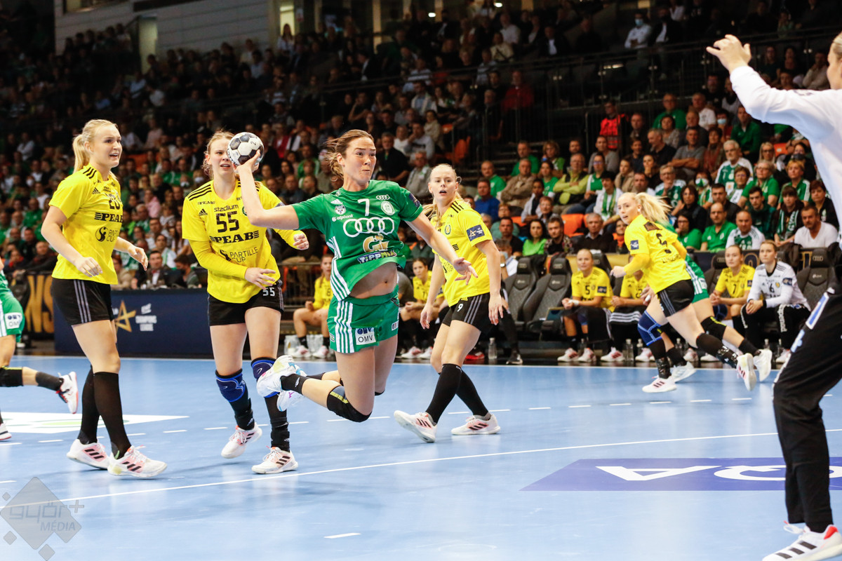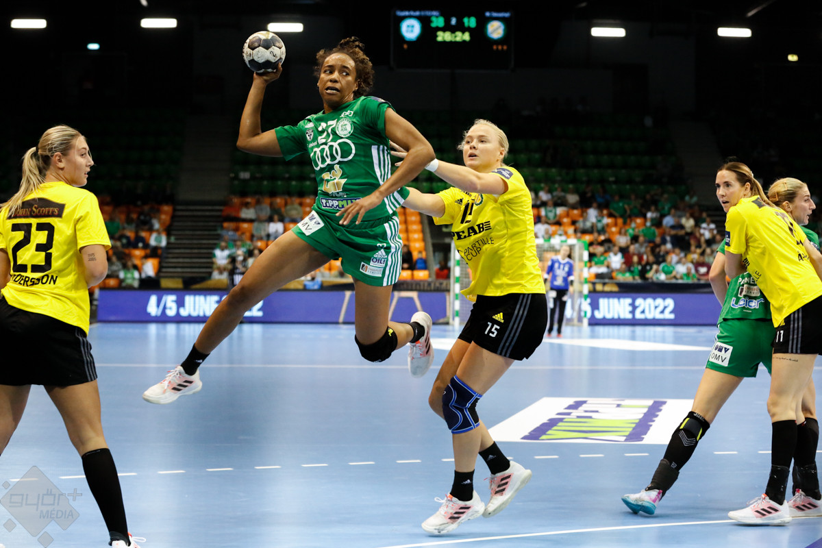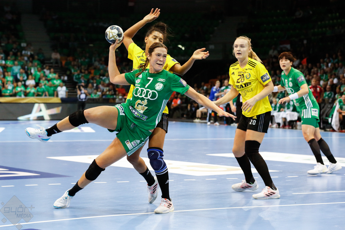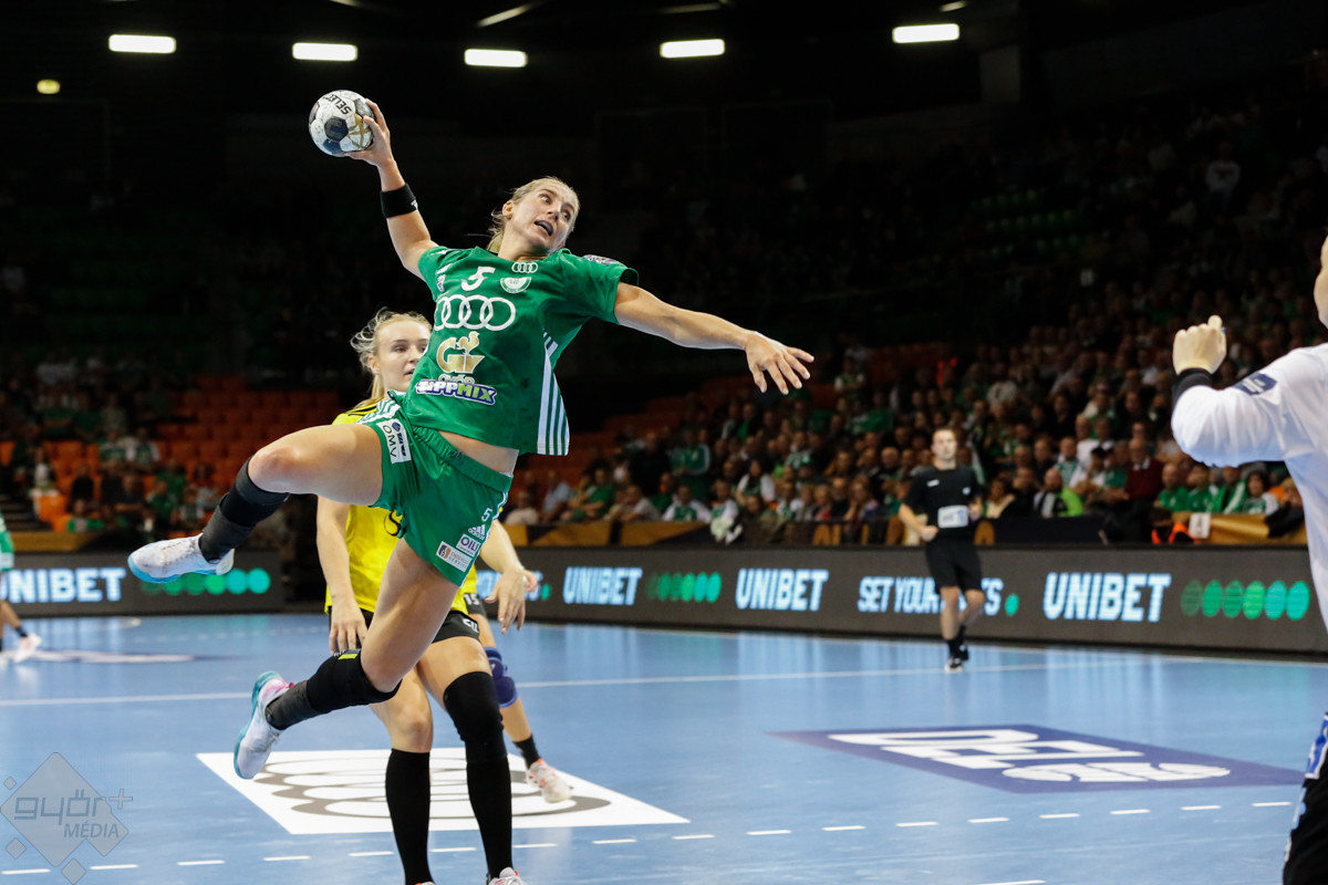 A mérkőzés keretéből Faluvégi Dorottya, Crina Pintea és Veronica Kristiansen maradt ki. Ambros Martín a Schatzl, Háfra, Oftedal, Brattset, Ryu, Lukács hatossal és Leynauddal a kapuban kezdett. Az első gólt a vendégek szerezték, de az ötödik percben már két góllal vezettek Lukácsék (3 – 1). Remekül működött a győri csapat védekezése, és a 12. percben már öt volt az előnye a svédekkel szemben (9 – 4). A félidő utolsó tíz percére hat gólos győri vezetéssel fordultak a csapatok (12 – 6). A közönség fantasztikus megoldásoknak tapsolhatott, a magabiztosan játszó hazai csapat Amandine Leynaud védéseinek, a kőkemény védekezésnek és a gyors támadásbefejezéseknek is köszönhetően az első játékrészt 20 – 9-es győri vezetéssel zárta.