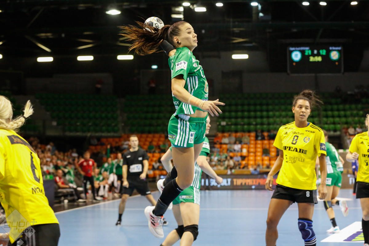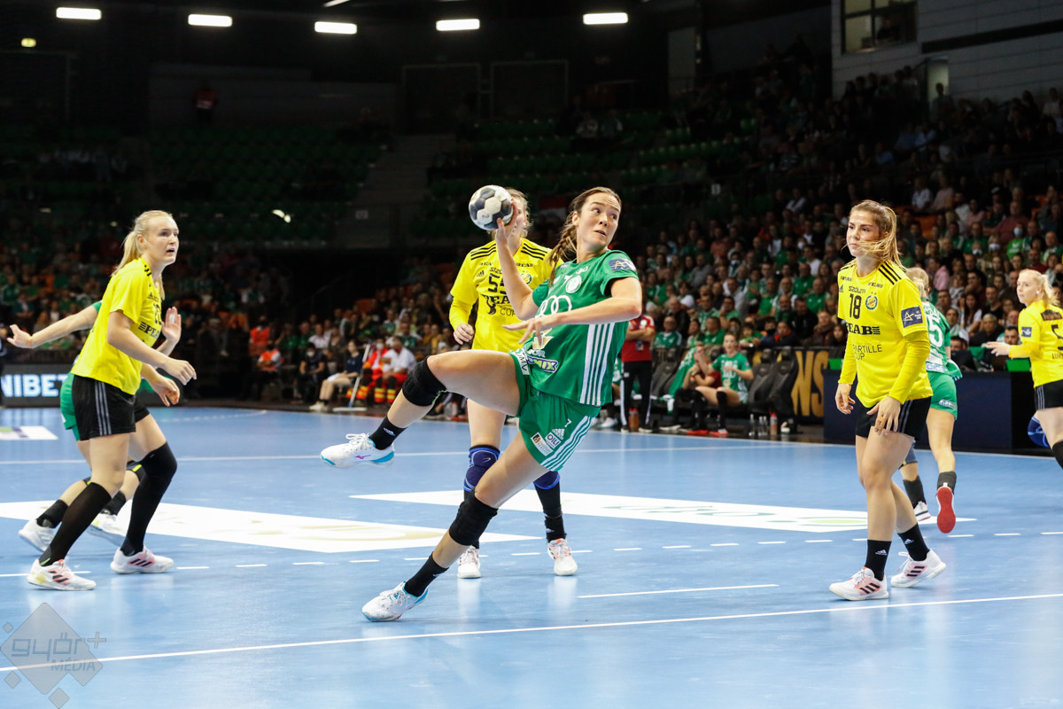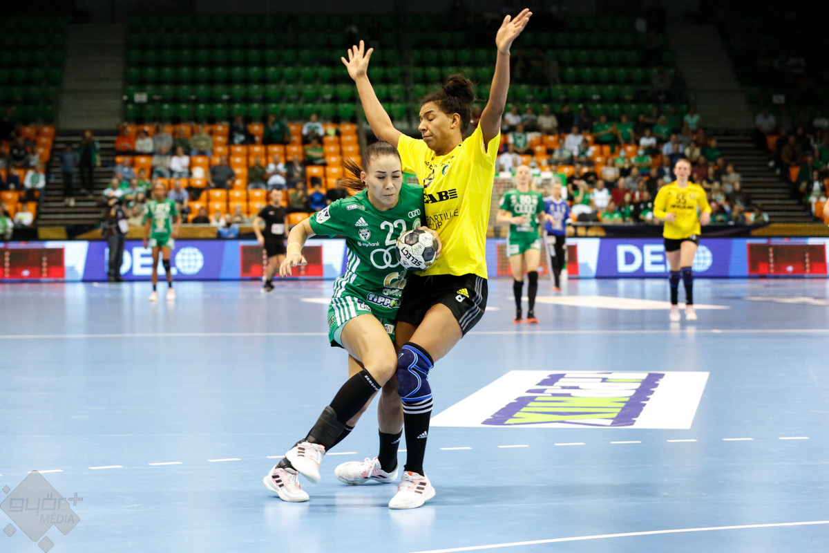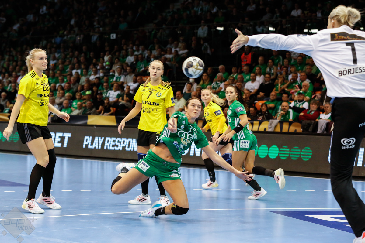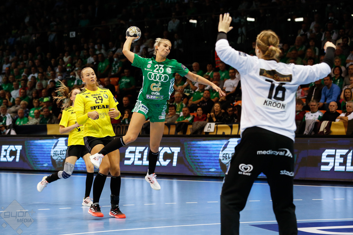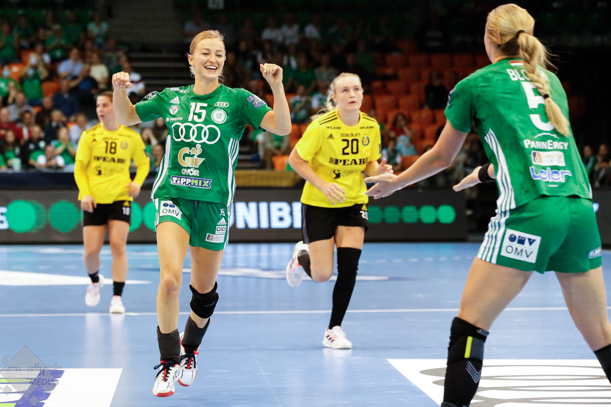 A mérkőzés keretéből Faluvégi Dorottya, Crina Pintea és Veronica Kristiansen maradt ki. Ambros Martín a Schatzl, Háfra, Oftedal, Brattset, Ryu, Lukács hatossal és Leynauddal a kapuban kezdett. Az első gólt a vendégek szerezték, de az ötödik percben már két góllal vezettek Lukácsék (3 – 1). Remekül működött a győri csapat védekezése, és a 12. percben már öt volt az előnye a svédekkel szemben (9 – 4). A félidő utolsó tíz percére hat gólos győri vezetéssel fordultak a csapatok (12 – 6). A közönség fantasztikus megoldásoknak tapsolhatott, a magabiztosan játszó hazai csapat Amandine Leynaud védéseinek, a kőkemény védekezésnek és a gyors támadásbefejezéseknek is köszönhetően az első játékrészt 20 – 9-es győri vezetéssel zárta.