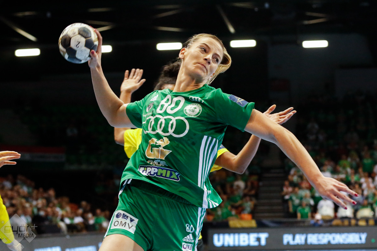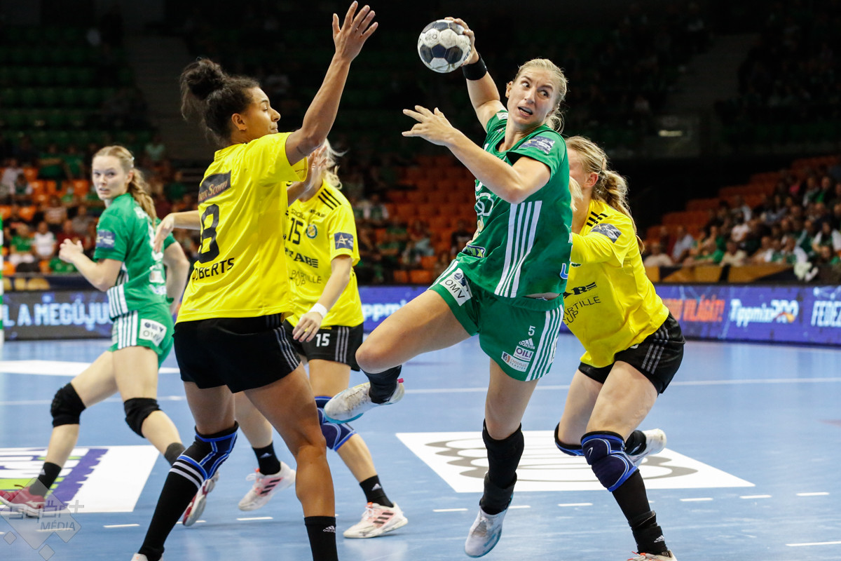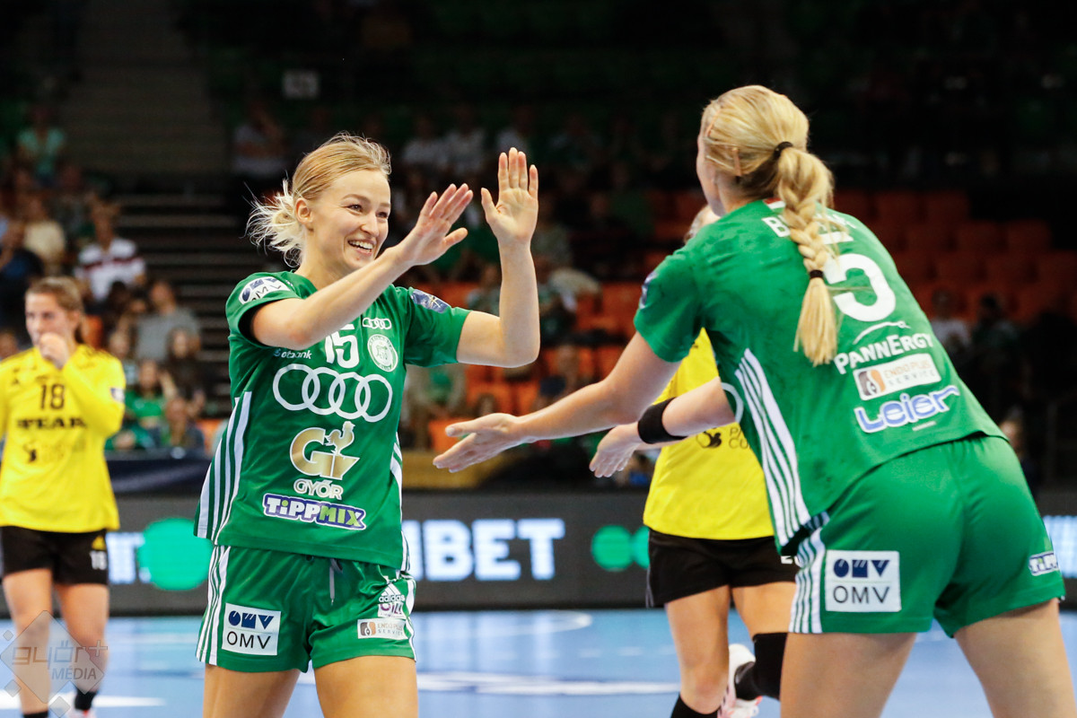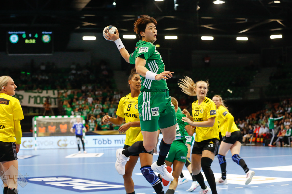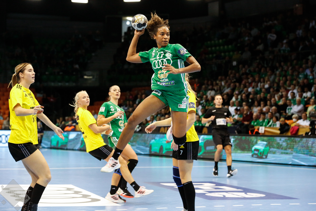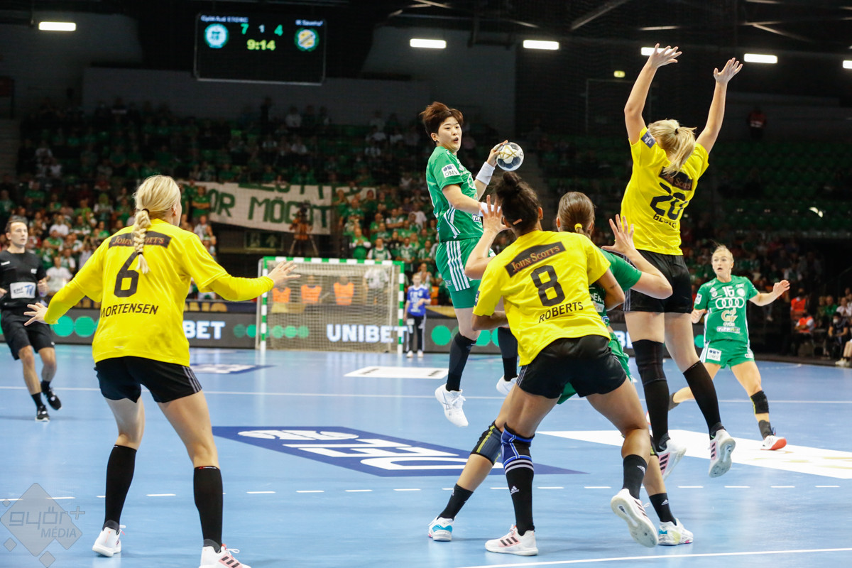 A mérkőzés keretéből Faluvégi Dorottya, Crina Pintea és Veronica Kristiansen maradt ki. Ambros Martín a Schatzl, Háfra, Oftedal, Brattset, Ryu, Lukács hatossal és Leynauddal a kapuban kezdett. Az első gólt a vendégek szerezték, de az ötödik percben már két góllal vezettek Lukácsék (3 – 1). Remekül működött a győri csapat védekezése, és a 12. percben már öt volt az előnye a svédekkel szemben (9 – 4). A félidő utolsó tíz percére hat gólos győri vezetéssel fordultak a csapatok (12 – 6). A közönség fantasztikus megoldásoknak tapsolhatott, a magabiztosan játszó hazai csapat Amandine Leynaud védéseinek, a kőkemény védekezésnek és a gyors támadásbefejezéseknek is köszönhetően az első játékrészt 20 – 9-es győri vezetéssel zárta.