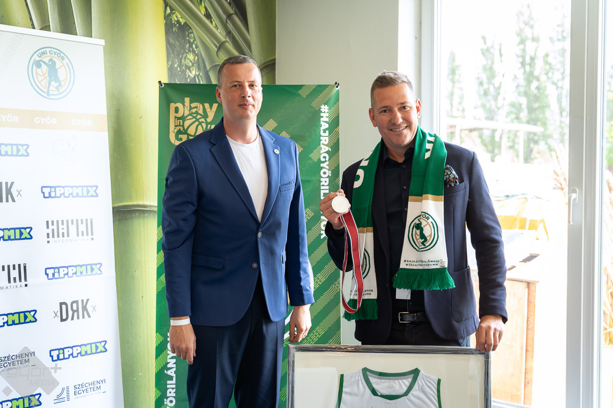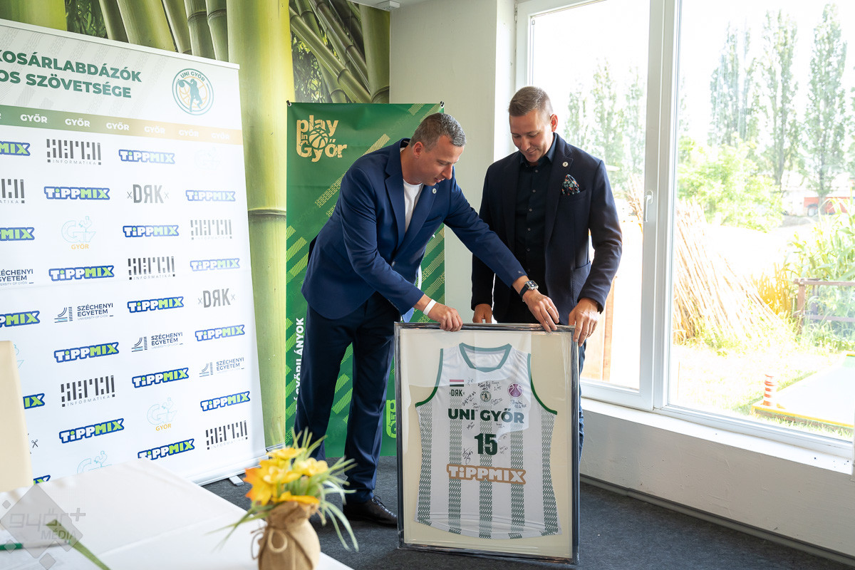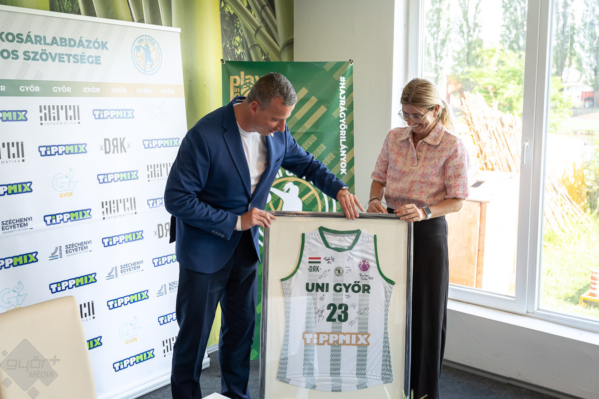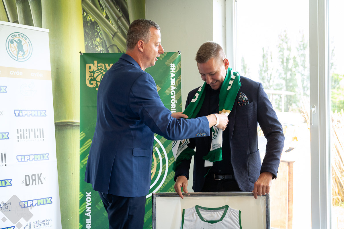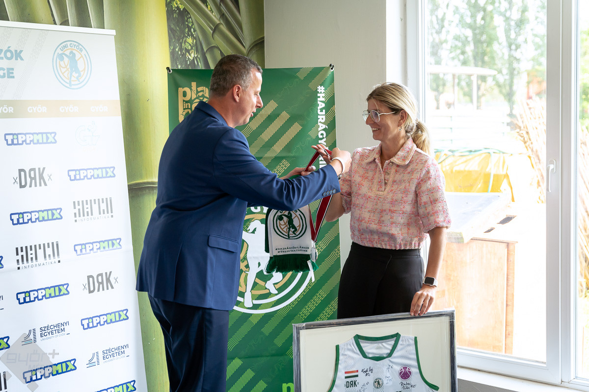 A Grabo-sátor építése egyébként még tovább növeli a lehetőségeket az utánpótlás számára, ezzel is erősítjük a kosárlabdát a városban” – mondta Radnóti Ákos, aki Szombati-Serfőző Eszterhez, a Széchenyi István Egyetem szolgáltatásokért és hallgatói életért felelős igazgatójához hasonlóan, dedikált mezt és sálat vehetett át a klub vezetésétől.