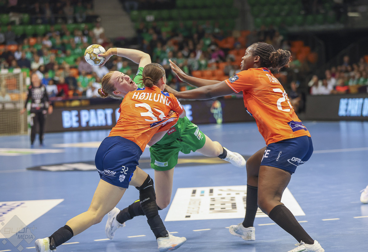 A Győrnek kétszer is lett volna alkalma megfordítani a mérkőzést, de sikertelen próbálkozás után újabb dán gól következett. (7:8). Szabálytalanságot követően Housheer hetese rendezte a helyzetet (9:9). Sandra Toft remek pillanatainak örülhettek a találkozón: a ziccerre érkező dánok két lövését is hárította. A győrieknek a 19. percben Housheer góljával sikerült fordítani (12:11). Blohm találatával újabb egy góllal nőtt a különbség, a Győr a mérkőzésen először tudott ellépni a vendégektől. A dánok többször bontogatták a védelmet, a 24. percben fej-fej mellett haladt a két együttes (14:14), a fordításra Blohm 26. percben érvényesített találatáig kellett várni, az előnyt a dánok szinte azonnal törölték is (15:15), majd ismét Blohm növelt, a dán hetesnek köszönhetően azonban újra döntetlenre álltak a csapatok (16:16). Az északiak szépen éltek minden lehetőséggel, dán góllal a félidei végeredményt 16:18-ra állították be.