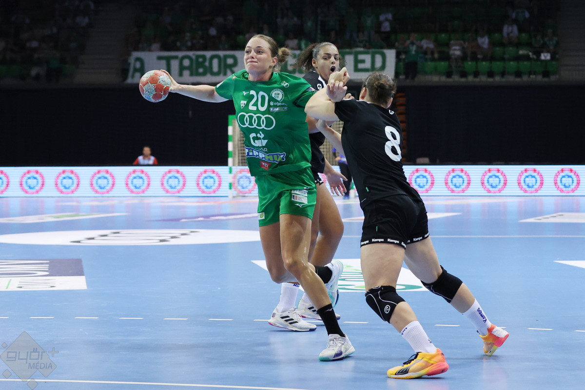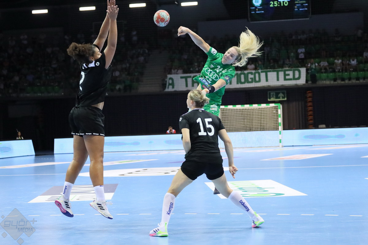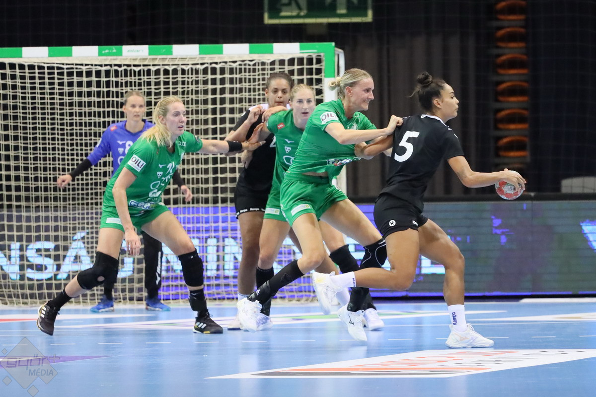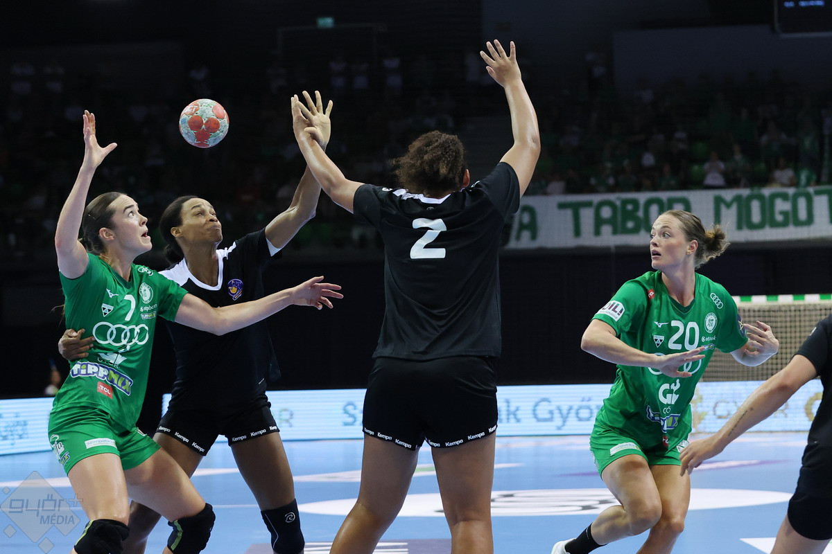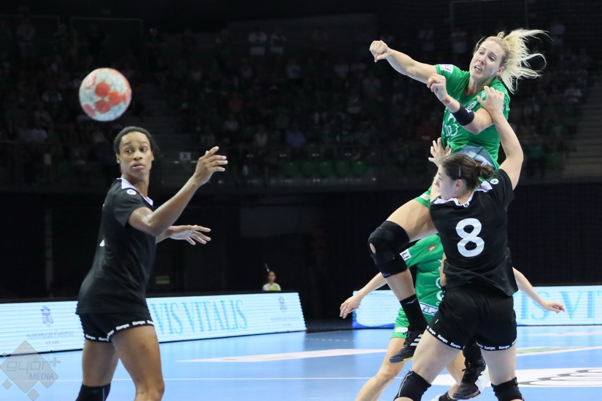 Öt nap felkészülés után nem csoda, az első negyedóra mindenesetre nem a mieinkről szólt. Bár a hatos fal egész jól mozgott együtt, támadásban pontatlanok voltunk, a kihagyott helyzetek és a technikai hibák után pedig nehezen birkóztunk meg a franciák lerohanásaival (15. p.: 4–7). Úgy tűnt, jókor jött a hazai időkérés, de a győri felzárkózásra ezt követően is várni kellett (20. p.: 7–10). A játékrész hajrájában aztán megindultak a lányok, és nemcsak visszajönni sikerült a meccsbe – Hovden nagyszerű teljesítményének köszönhetően az egyenlítés (24. p.: 11–11), majd Jörgensen góljával először a találkozó folyamán fordítás is összejött a mieinknek (29. p.: 13–12). Az utolsó percben Housheer is megvillant, így kétgólos előnyről (14–12) vághattunk neki a második félidőnek.
