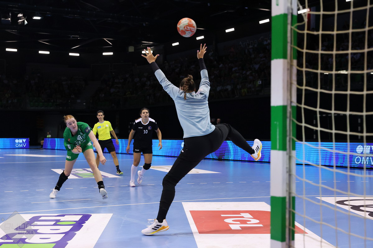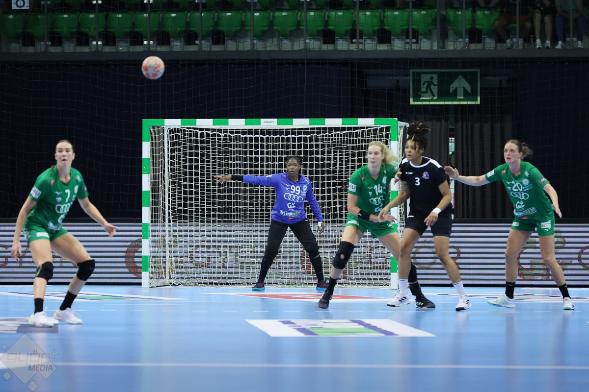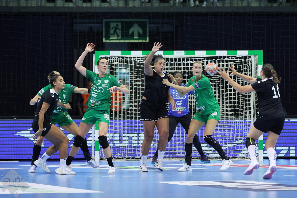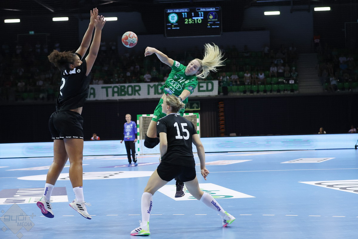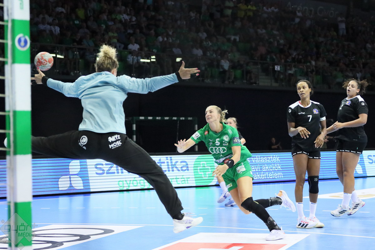 Öt nap felkészülés után nem csoda, az első negyedóra mindenesetre nem a mieinkről szólt. Bár a hatos fal egész jól mozgott együtt, támadásban pontatlanok voltunk, a kihagyott helyzetek és a technikai hibák után pedig nehezen birkóztunk meg a franciák lerohanásaival (15. p.: 4–7). Úgy tűnt, jókor jött a hazai időkérés, de a győri felzárkózásra ezt követően is várni kellett (20. p.: 7–10). A játékrész hajrájában aztán megindultak a lányok, és nemcsak visszajönni sikerült a meccsbe – Hovden nagyszerű teljesítményének köszönhetően az egyenlítés (24. p.: 11–11), majd Jörgensen góljával először a találkozó folyamán fordítás is összejött a mieinknek (29. p.: 13–12). Az utolsó percben Housheer is megvillant, így kétgólos előnyről (14–12) vághattunk neki a második félidőnek.