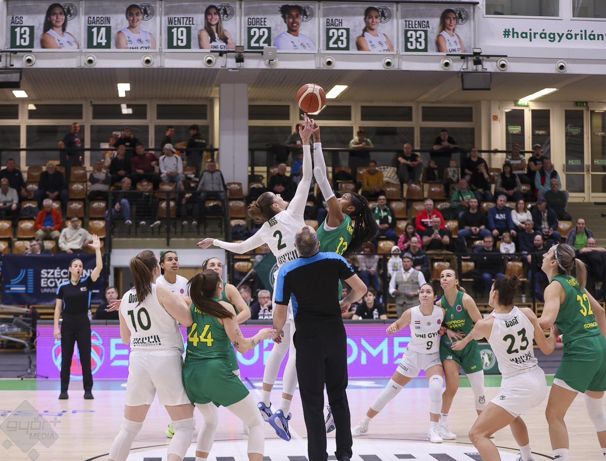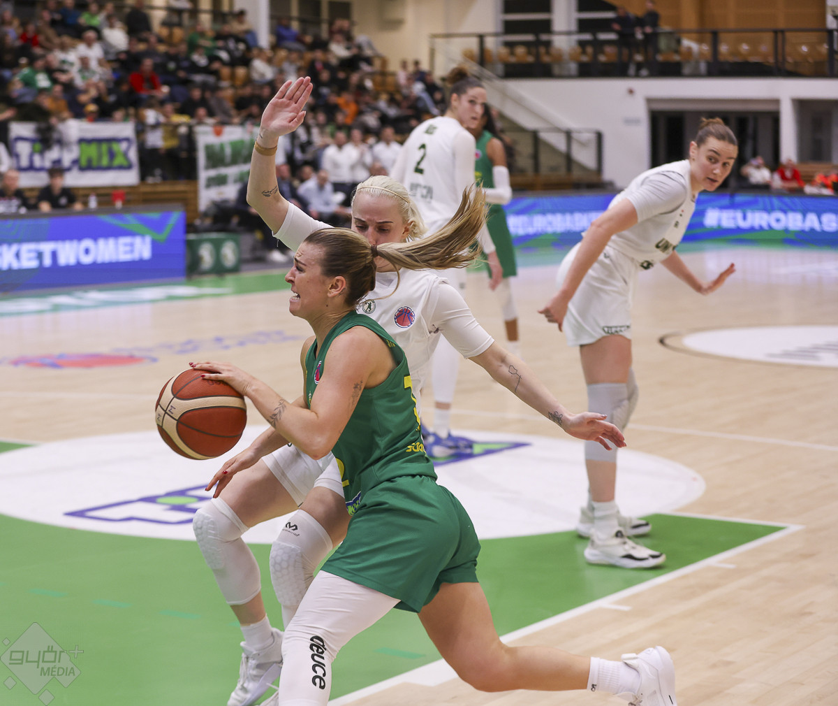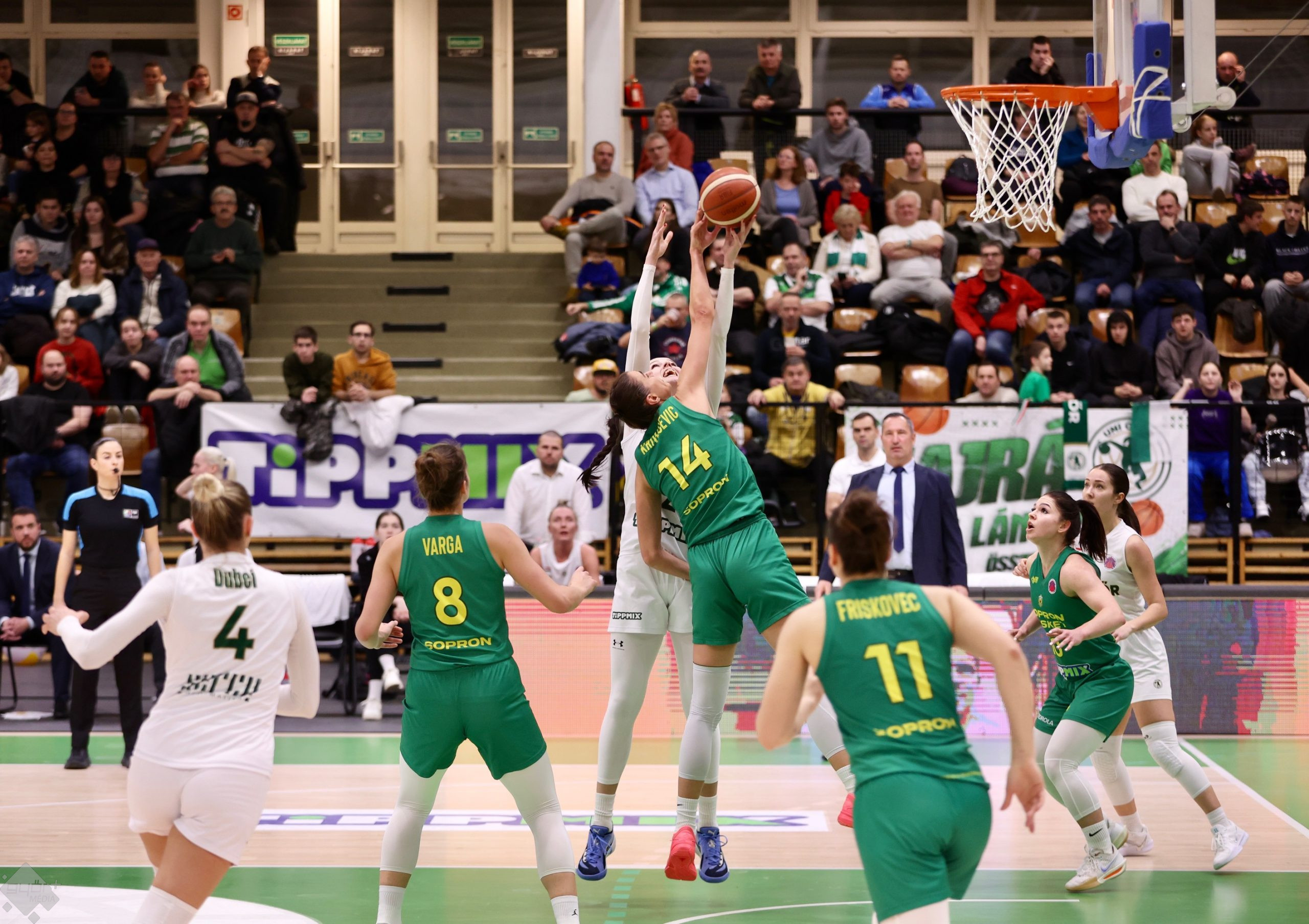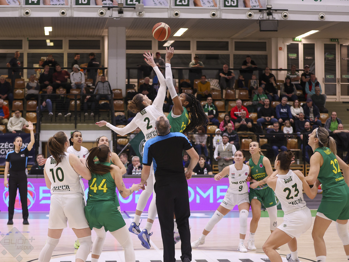 “Mindkét csapat nagy elánnal vetette bele magát a küzdelembe, az első kosarat Bach szerezte, majd Friskovec pillanatai következtek, zsinórban nyolc pontot szerzett, benne egy hármast, a 3. perc végén így 8–2 volt a vendégeknek. Kiss Virág büntetőkkel törte meg a szlovén játékos sorozatát. Dombai hárompontosa után egy pont mínuszban voltunk (5. perc: 9–10), Angyal kosár plusz büntetőjével pedig kiegyenlítettünk (12–12). Kiss közelije után pedig megint nálunk volt a vezetés (14–12). Hullámzó volt a játék, a zöld-sárgák egy 5–0-val megint fordítottak (7. perc: 14–17). A szakasz hajrájában Telenga kosarával megint egalizáltunk, de Varga Alíz triplát, Krivacevic duplát dobott (18–23). A negyed végére egy pontra felzárkóztunk (22–23).