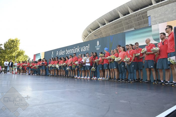 Az aranygép késett, így a versenyzőket és edzőiket szállító buszok háromnegyed 5-kor gördültek be a Puskás Aréna parkjába. A toronyépület árnyékában megtartott ünnepi köszöntésen Gyulay Zsolt, a Magyar Olimpiai Bizottság elnöke köszöntötte az egybegyűlteket, majd a színpadra szólította a párizsi ötkarikás játékokon részt vett olimpikonokat, köztük az aranygéppel hazatérteket. A szurkolók hatalmas tapssal köszöntötték a sportolókat.