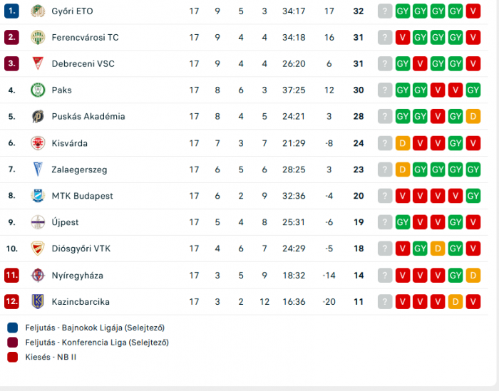 A Ferencváros és a Debrecen 1-1 ponttal van lemaradva az ETO mögött. A fővárosiak 9-4-4-es mérleggel állnak, 34:18-as gólaránnyal, a legutóbbi meccsükön épp a Debrecentől kaptak ki, akiknek a mérlege ugyanilyen, 26:20-as gólaránnyal.