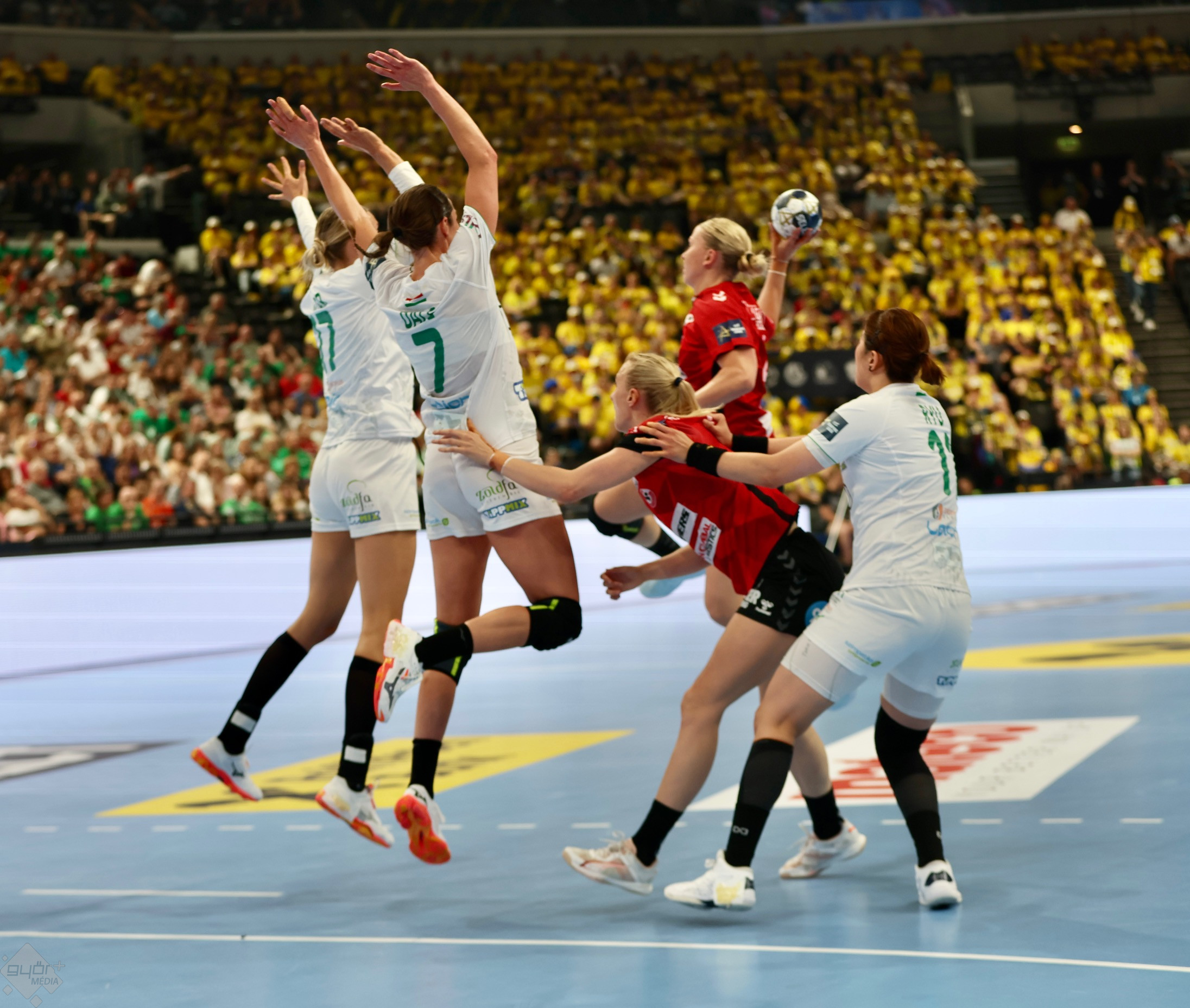A találkozón a győriek támadhattak elsőként, amiból az első találat is megszületett: Jörgensen volt eredményes. A lányok résen voltak, jól olvasták a játékot és jól működtek a kontrák. A cselek nagyon ültek, az első játékrész derekára háromgólos előnyt sikerült kidolgoznia a győrieknek (9-6). Per Johansson együttese uralta a játékot, és nem lepődtek meg akkor sem, amikor a dánok az üresen maradt kapura törtek: Jörgensen óriásit mentett. A dánok azonban megérkeztek a játékba, szűkítettek a hátrányukon tíz perccel a lefújás előtt (11-10).