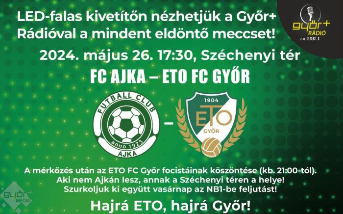 Kilenc fájdalmasan hosszú év után juthatnak fel ismét a fiúk az első osztályba! A sorsdöntő Ajka – ETO FC Győr labdarúgó mérkőzés vasárnap fél hatkor kezdődik, de a Győr+ Rádió stábja már délután négy órától kitelepül a Széchenyi térre! Aki nem Ajkán lesz, annak itt a helye!