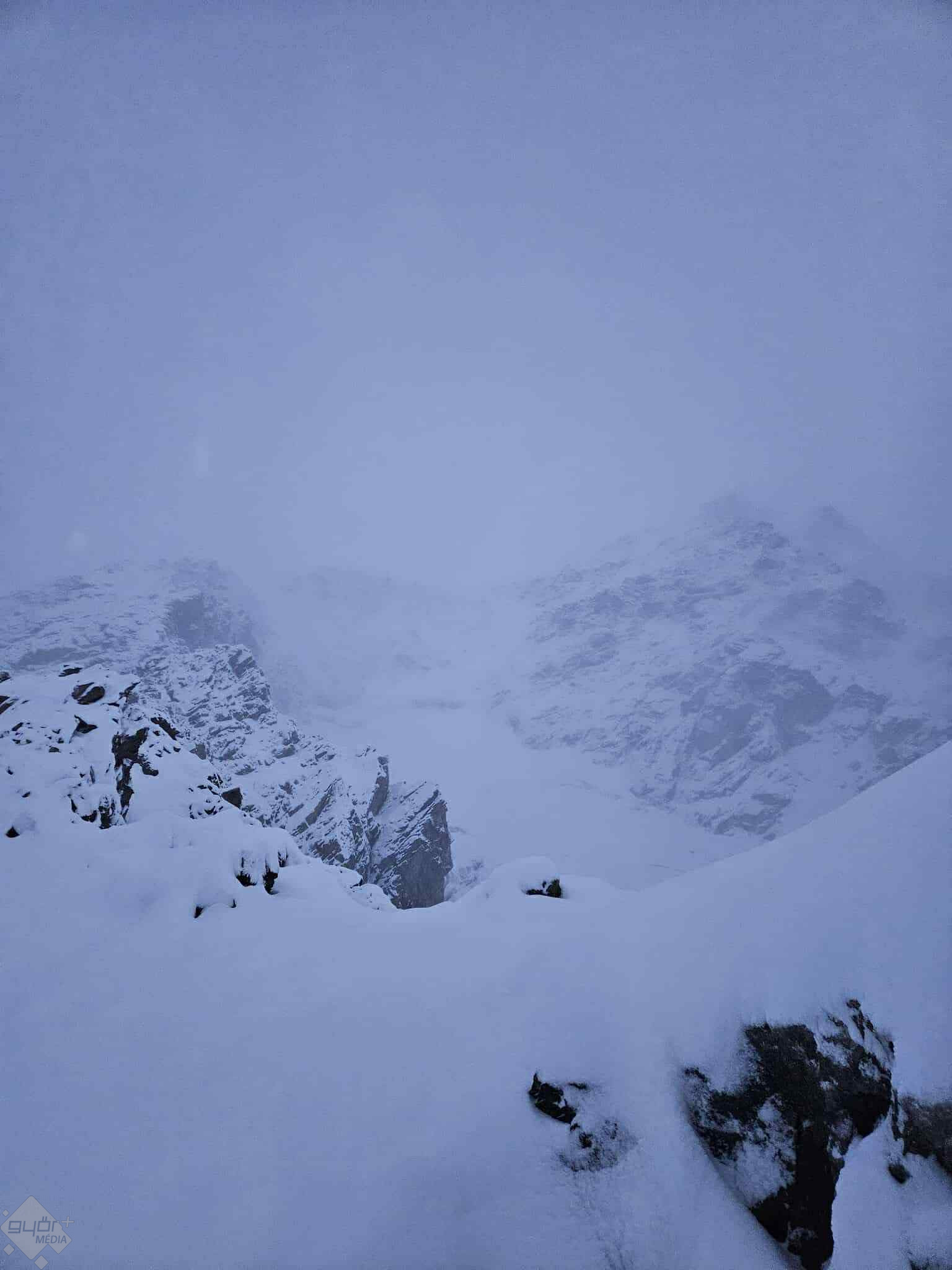 „Azt mondhatjuk, hogy az esélyeink a nullára csökkentek a Skarát illetően. Én Szabival még tegnap lejöttem 3000 méterre aludni, ezért nem láthatjátok a képen a sátrainkat. Itt egész reggelig esett a hó, körülbelül 20 centiméternyi latyakos, vizes hó esett le. Peti meg Barna fent aludtak a 3500-on hagyott táborban, vagyis próbáltak. Ott 30 centiméter hó lett reggelre. A lejövetelünk is nehézkes volt.
