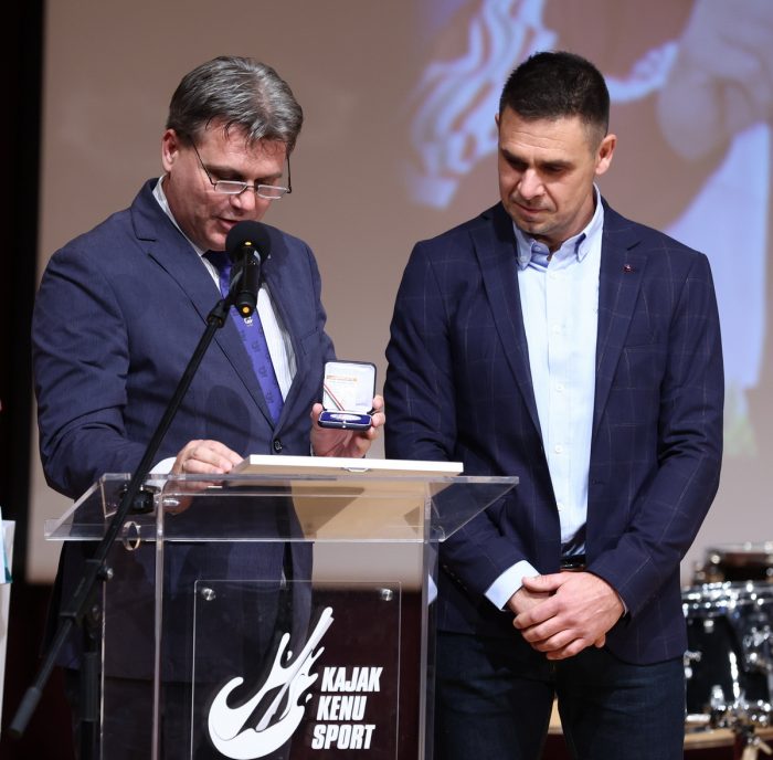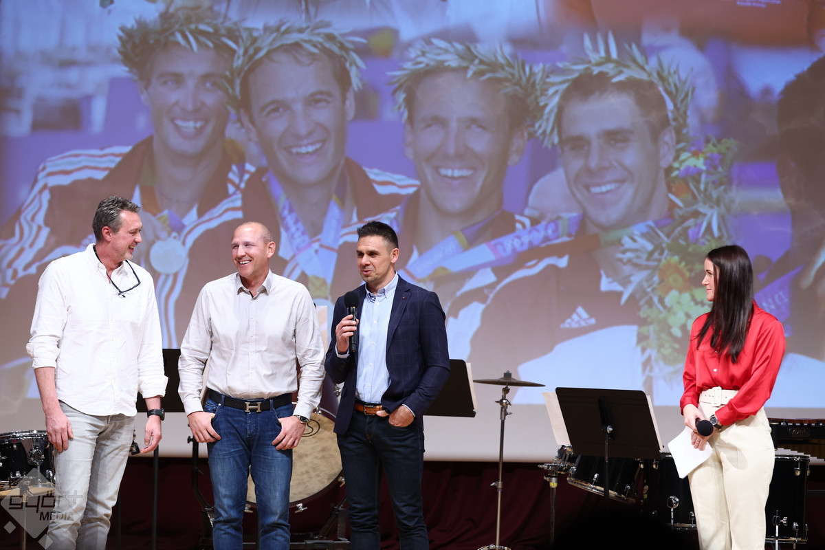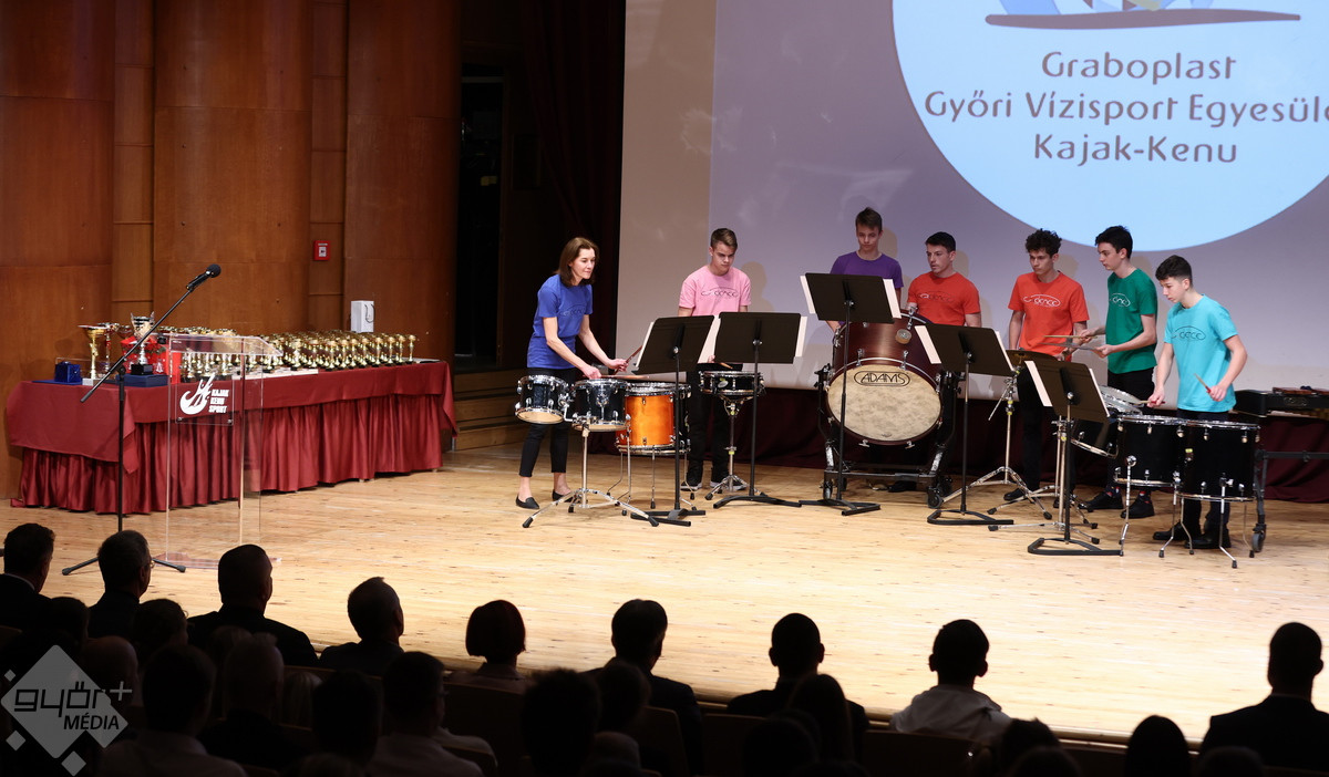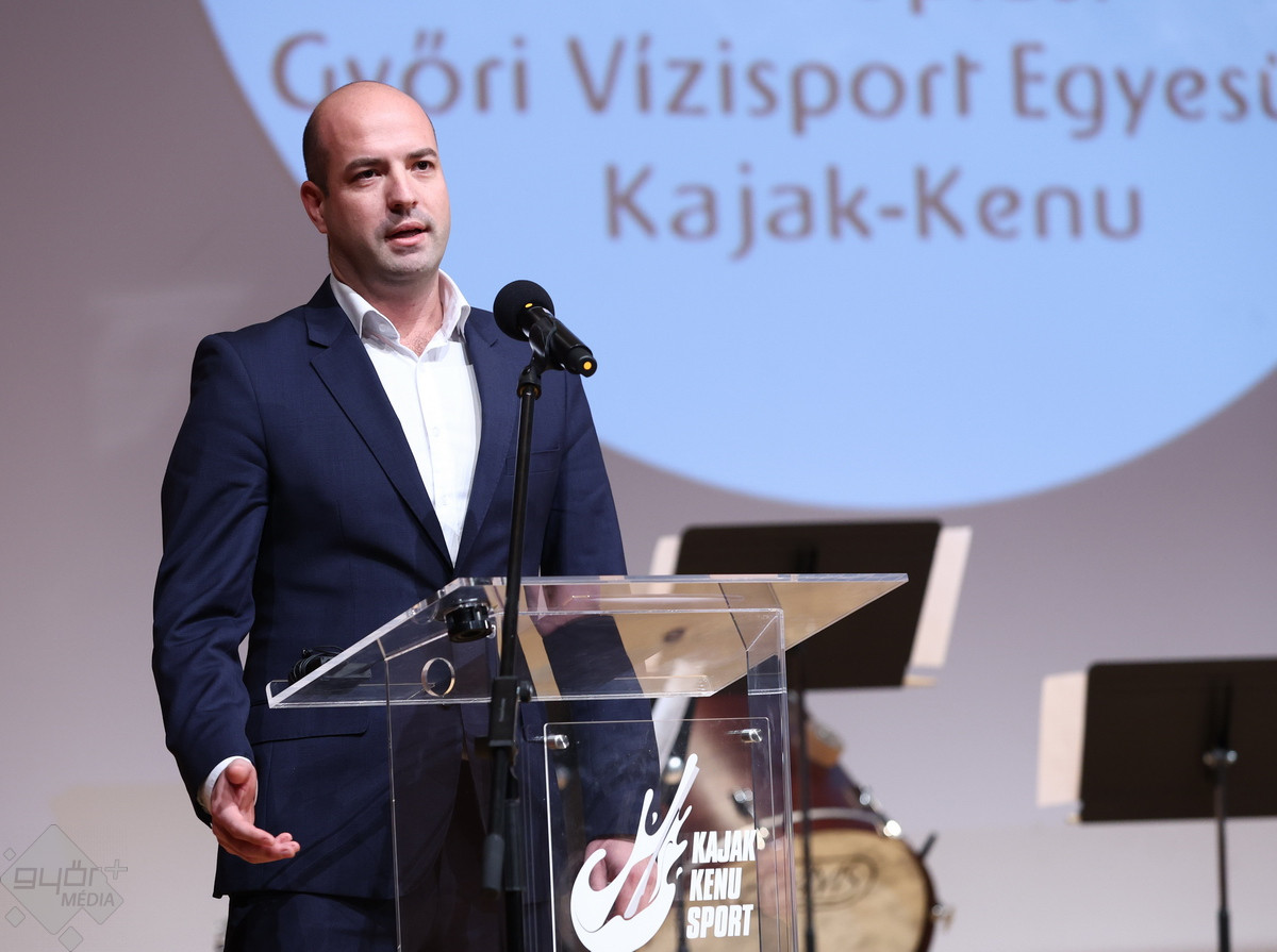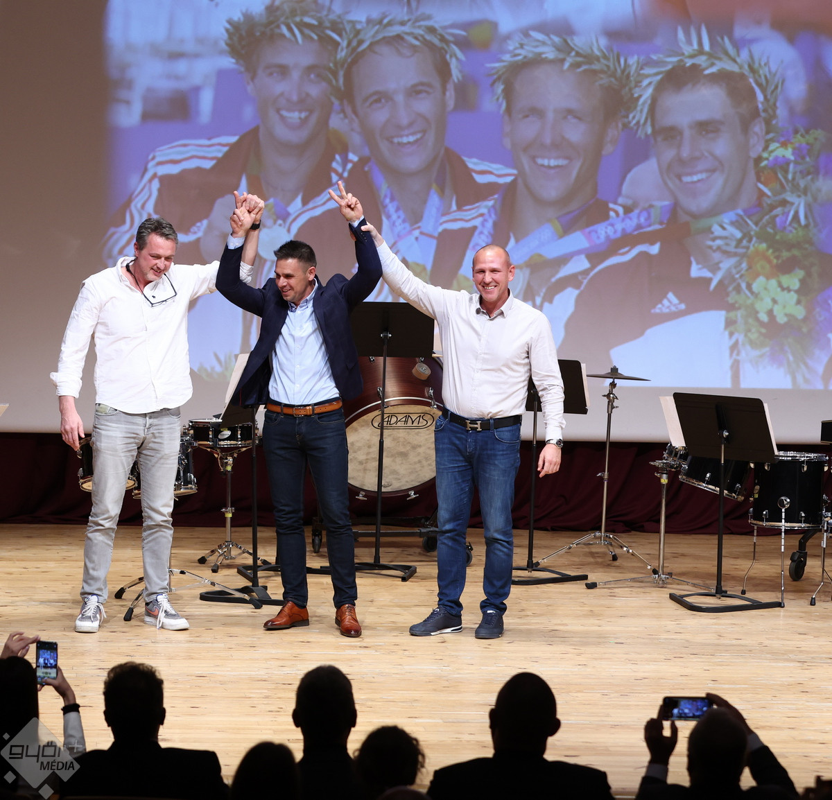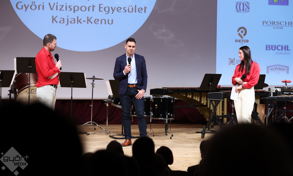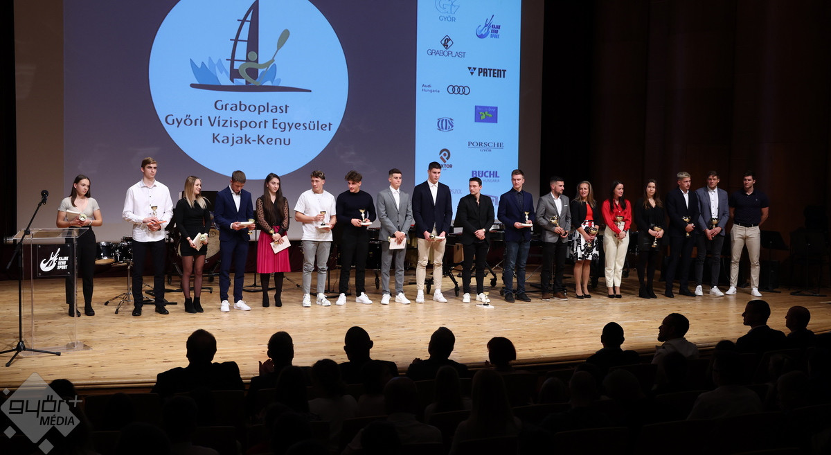 Ábrahám Csaba és Weisz Róbert, a Győri Vízisport Egyesület elnöke és társelnöke pedig egy gyönyörű, huszonhárom karátos aranyból készült evezőlapáttal mondott köszönetet a klubnál eltöltött évekért, miközben vastaps zúgott a teremben.