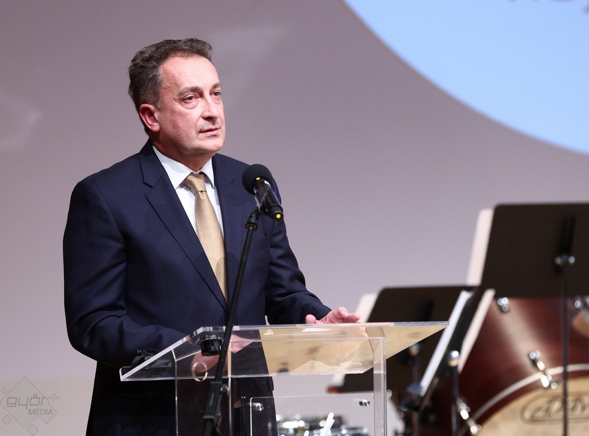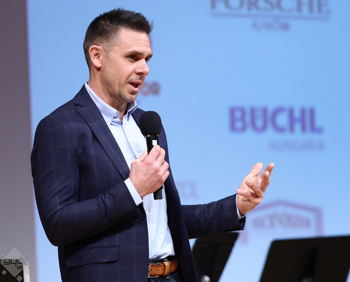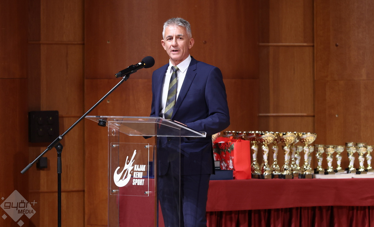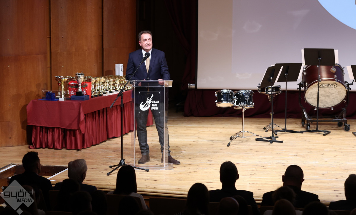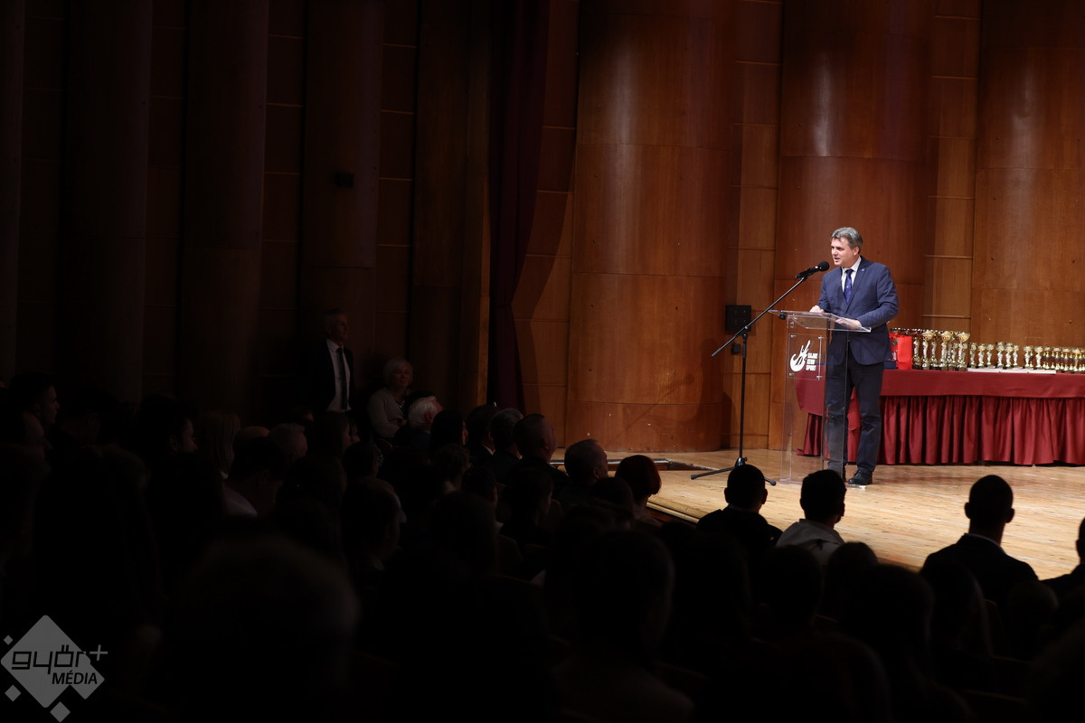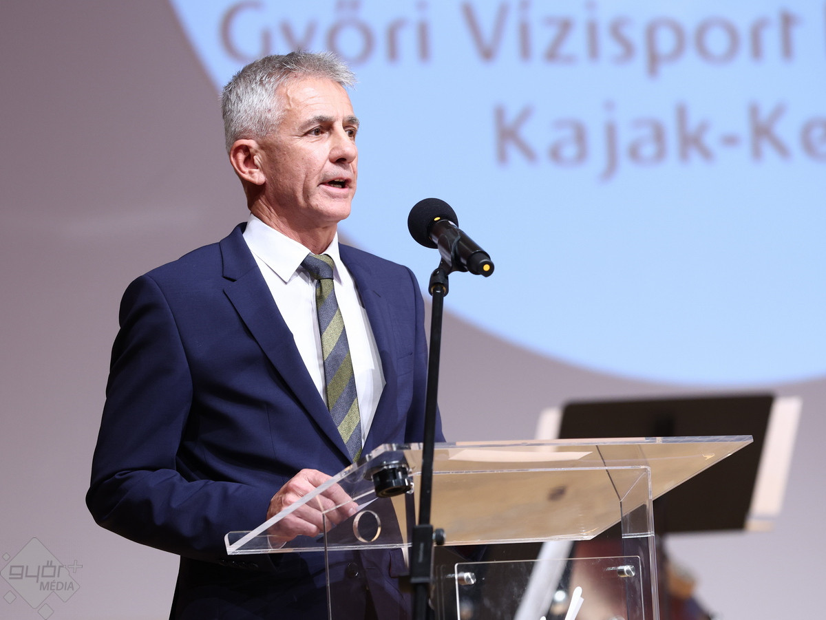 Kammerer a színpad közepén állva meghatottan mondott köszönetet az elmúlt huszonöt évért Győrnek, a pályatársaknak, az edzőknek és a családjának: