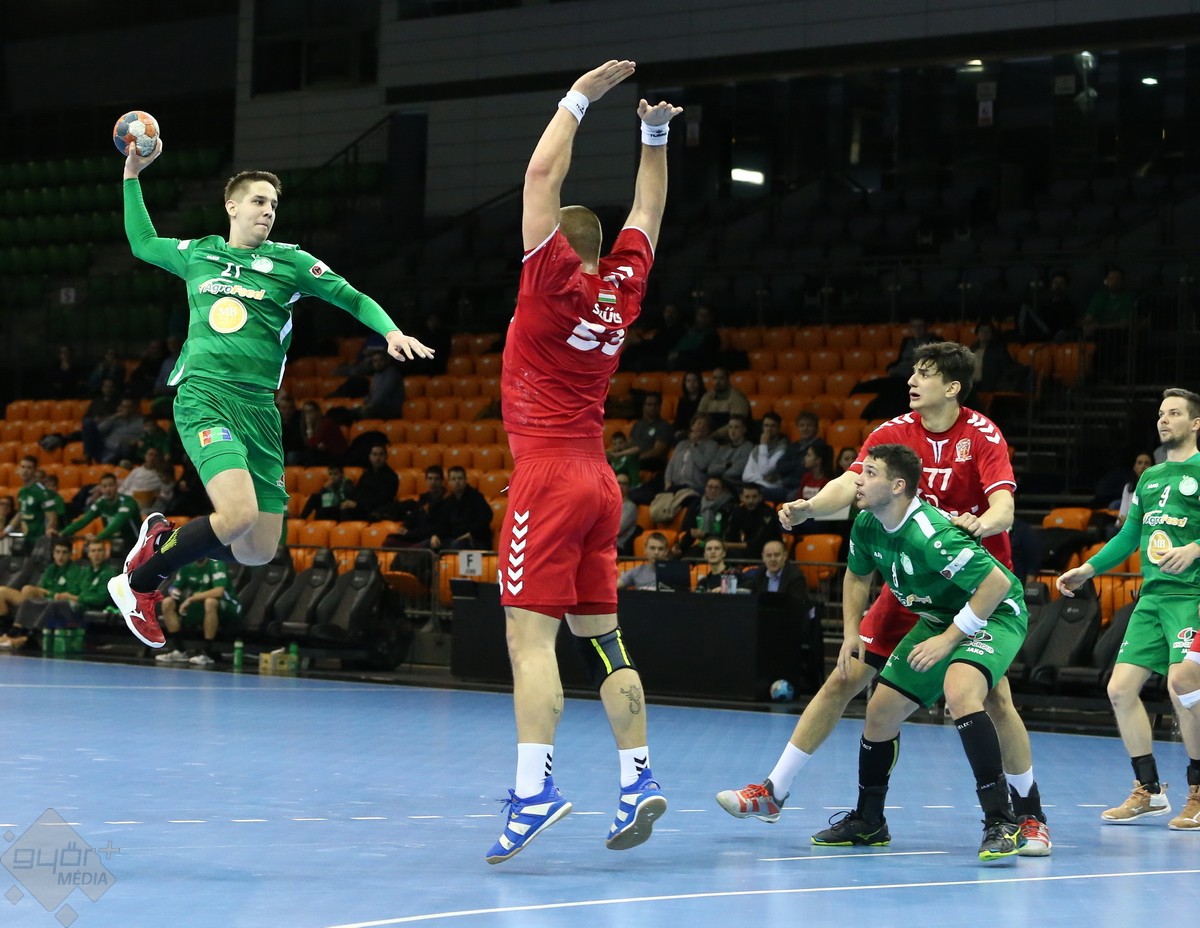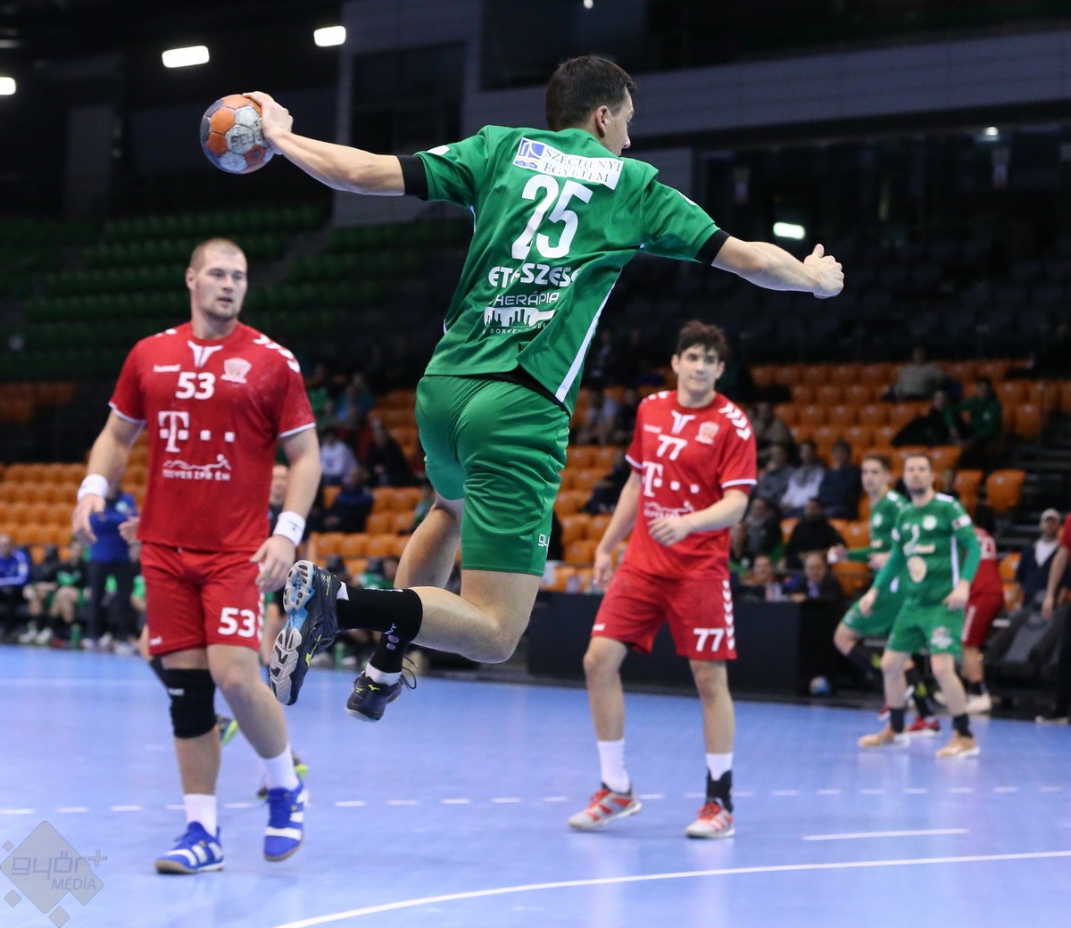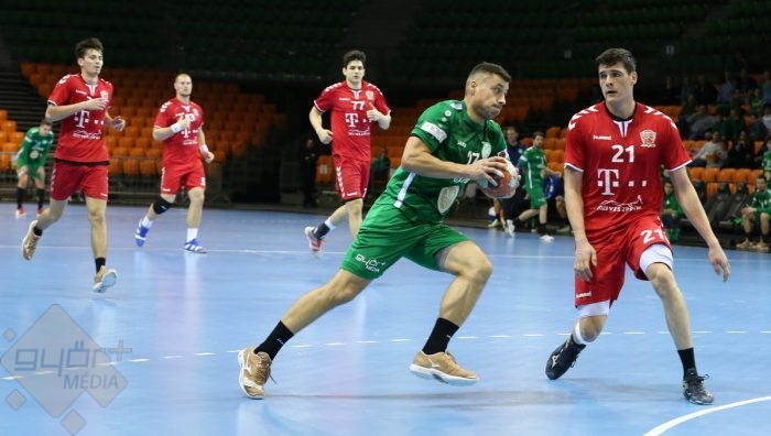 Sorozatosan jó védekezést mutattak a győriek, amikor Paár többször is gyors indulásból tudott eredményes lenni. Ezt követően a fiatalok is pályára léptek, Vékony és Fekete kapott játéklehetőséget. A 20. perchez érkezve fej-fej mellett álltak a csapatok és annak ellenére, hogy háromszor is emberhátrányba kerültek a zöld-fehérek, Fekete, Németh és Papp góljaival tartani tudták a döntetlen eredményt. Félidő: 14-14.