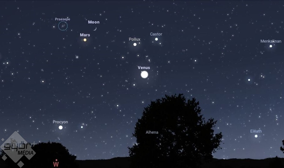 Szerdán a Holdhoz a Mars és a Jászol-halmaz lesz látszólagosan közel a nyugati horizont felett, bár még ezen az estén is a közelükben láthatjuk a Vénuszt, a Polluxot és a Castort is. Ekkor a hízó Holdtól balra, látszólagosan 5,5 fokra látjhatjuk a Jászol-halmazt, a Hold alatt látszólagosan nagyjából 3,5 fokra pedig a Marsot. A triót szintén sötétedés után érdemes keresni az esti égbolton, nagyjából éjfélig lesznek a horizont felett.