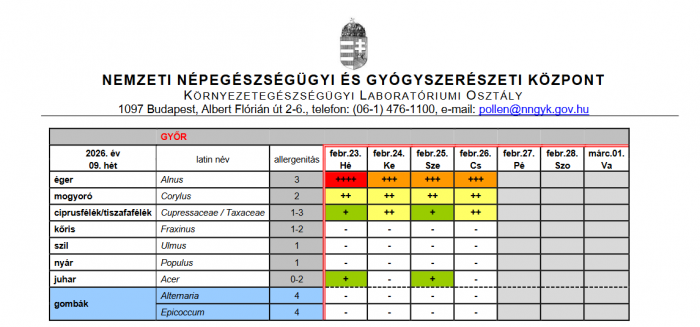 A mogyoró pollenkoncentrációja országosan közepes, az égeré, valamint a ciprus-és tiszafaféléké jellemzően a közepes-magastartományban alakulhat, helyenként akár a nagyon magas szintet is elérheti. A juhar, a kőris és a nyár virágporának koncentrációja országosan még alacsony, azonban esetenként elérheti a közepes szintet is. Regisztráltak már a szil, illetve a fűz pollenjéből is néhány szemet, legfeljebb alacsony koncentrációban – tájékoztat a Nemzeti Népegészségügyi és Gyógyszerészeti Központ (NNGYK).