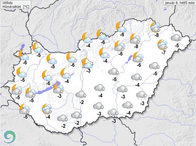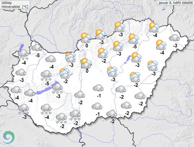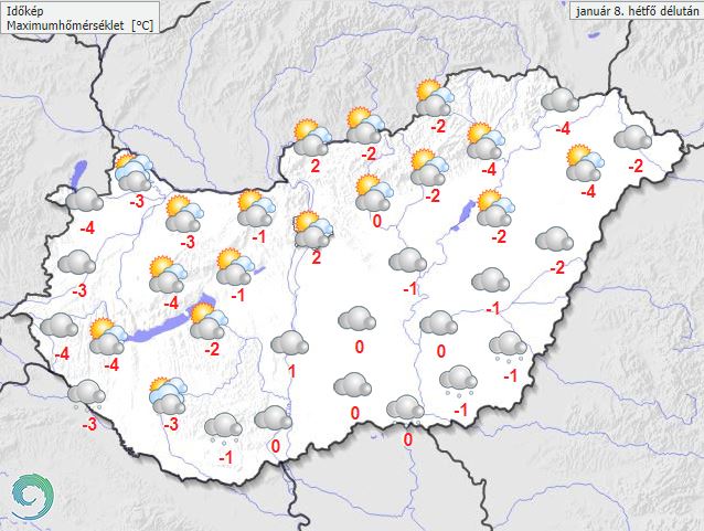 Az északi, északkeleti szél többfelé lesz erős, a Dunántúl középső és nyugati részén, valamint északkeleten viharos. Délutántól veszít némileg erejéből a szél. A legmagasabb nappali hőmérséklet -5 és +2 fok között várható, az ország középső részein emelkedhet fagypont fölé a hőmérséklet. Késő estére -6 és -1 fok közé csökken a hőmérséklet.