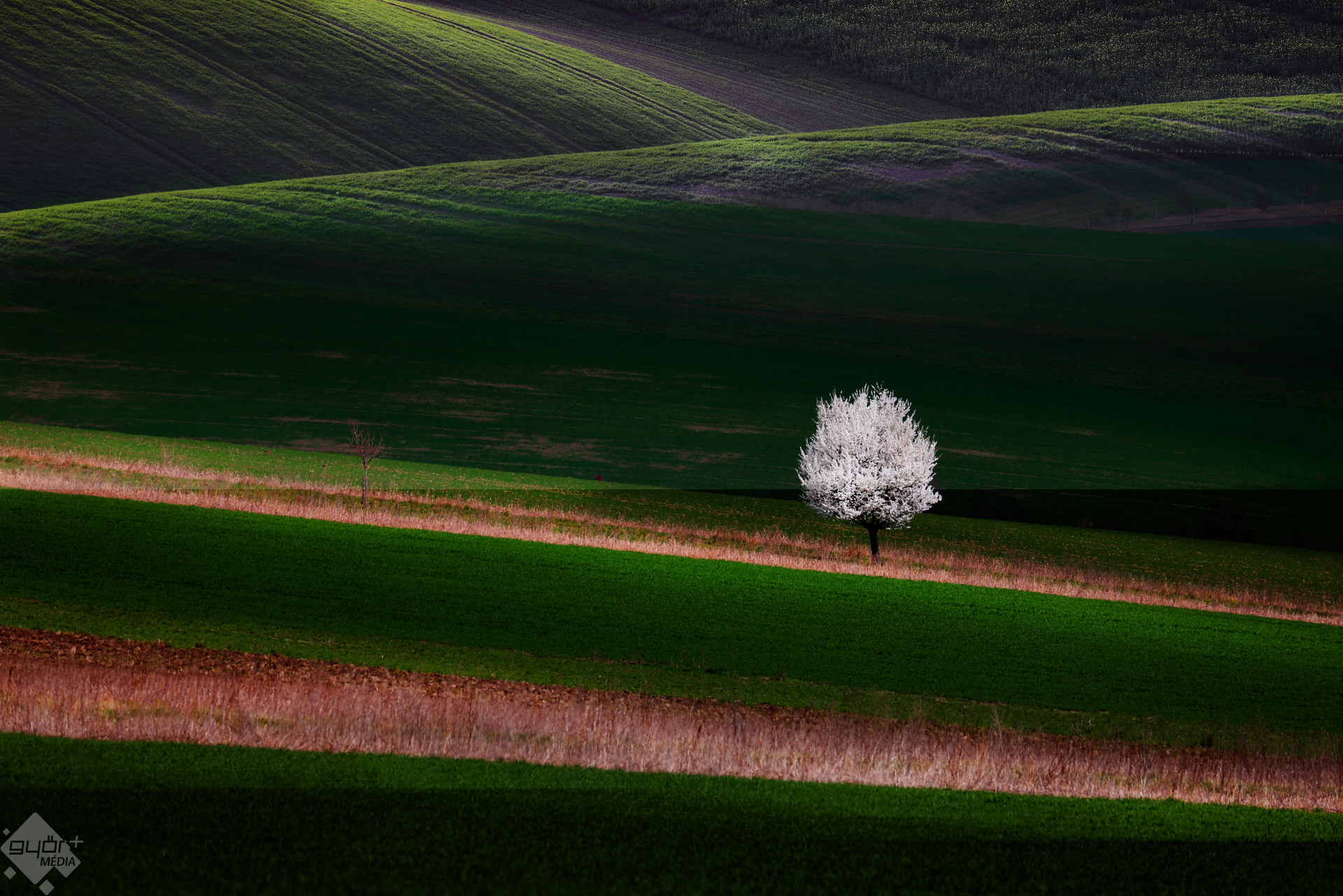 „Nagyjából egy másfél órás útról beszélünk, hajnalban autóba ülök, 4 óra körül, napkeltére ott vagyok – fontos, mert ilyenkor adja a nap ezeket a jellegzetes hosszú árnyékokat. Nagyjából fél hat, háromnegyed hatra odaérek, egy rövid reggeli, és utána járom a vidéket. A képen szereplő fát már kinéztem korábban, de első alkalommal nem sikerült megfotózni. Másnap a kollégákkal mentem vissza, afféle csapatépítőnek is szántam, de ismét nem voltak jók a fények. Harmadnap is felhős időnk volt, ráadásul ekkor még szürke volt minden a fa környezetében. Kilenc nap alatt összesen hétszer mentem ki ehhez a fához, az utolsó napon, nagyjából 10 perces időszakban volt egyetlen fénypászma, ami szinte végigrohant a tájon, amikor ott jártam. Besütötte azt a völgyet, ahol ez a kis fa volt, és látszott, hogy még a mögötte lévő dombok is kaptak fényt, megsütötte mindegyik dombnak a tetejét a fény, így exponáltam kettőt, hazajöttem, és megvolt a képem” – részletezi a fotós.