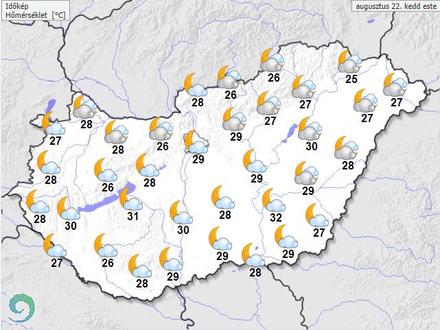 Este az ország nagyobb részén gyengén felhős vagy derült időre van kilátás, de az északi, északkeleti megyékben erőteljessé válik a gomolyfelhő-képződés. Utóbb említett részeken az éjszaka folyamán elszórtan záporok, zivatarok, néhol heves zivatarok is kialakulhatnak. A légmozgás jobbára mérsékelt marad, de zivatarok mentén viharos erejű széllökések előfordulhatnak.