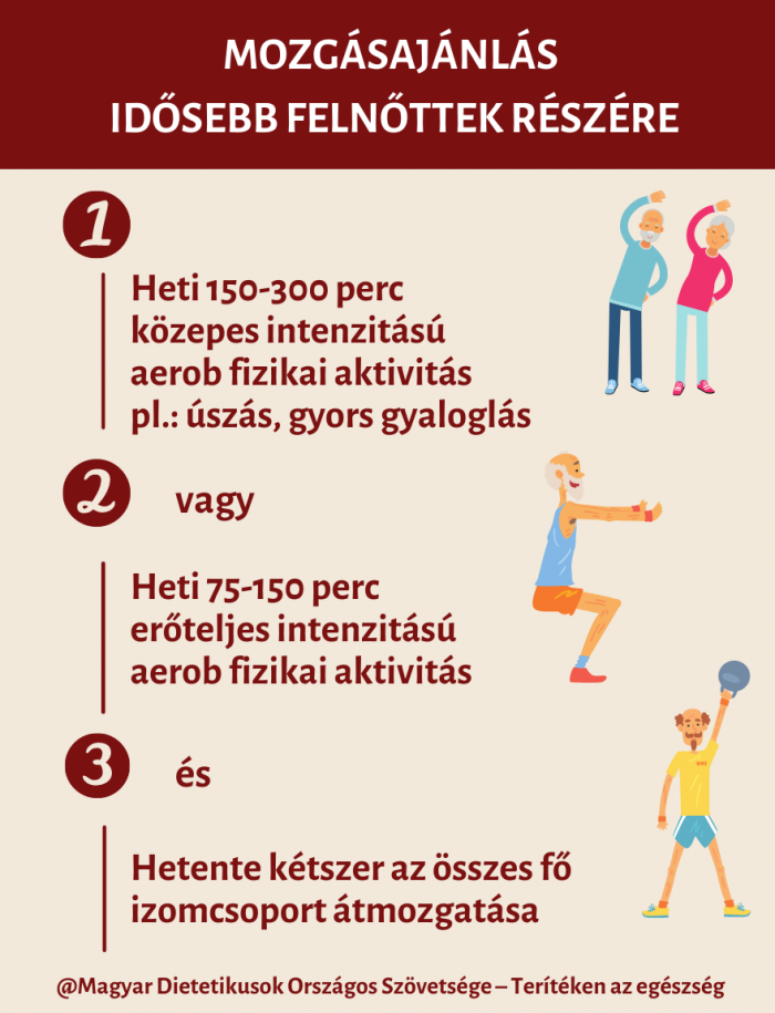 A Magyar Dietetikusok Országos Szövetsége az alábbi ábrán vette sorra mozgásajánlását.