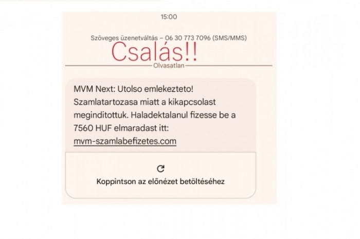 Az elmúlt időszakban megszaporodtak az MVM Next nevével visszaélő, SMS-üzenetek útján elkövetett csalási kísérletek. A módszer megegyezik a korábban tapasztaltakkal: az elkövetők egy állítólagos, lejárt tartozás befizetésére szólítják fel a címzetteket, és a fizetés elmaradása esetére a szolgáltatás kikapcsolását helyezik kilátásba – olvasható a police.hu oldalán.