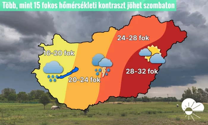 Nagy lesz a hőmérsékleti kontraszt a nyugati és keleti tájak között: miközben a Dunántúl nyugati felén csak 16-20 fokra készülhetünk, addig az ország középső harmadán 21-26, keleten még 27-32 fokot mutathatnak a hőmérők a legmelegebb órákban.