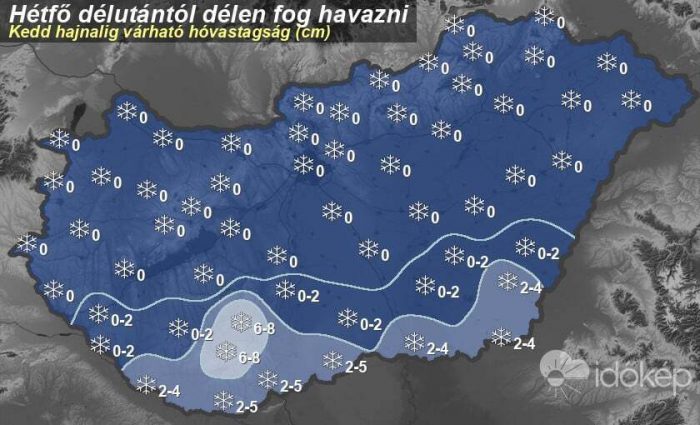 Főként tehát napnyugtát követően fehéredhet ki egyre többfelé a táj délen, kedd hajnalig a Mecsekben vastagabb, akár 6-8 centis hótakaró is kialakulhat.