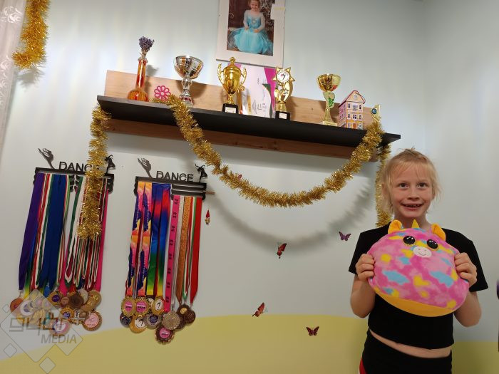 A lányok szobája valódi tánc-szentély, büszkén mutatták minden eddig megszerzett elismerésüket.