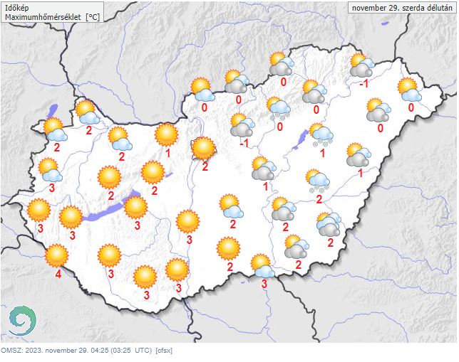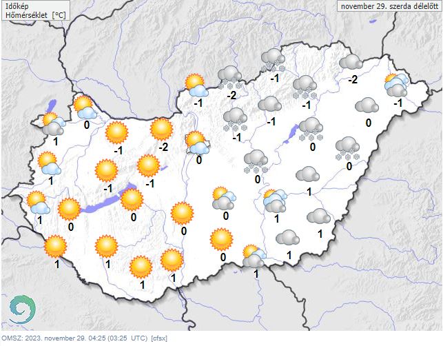 Az ország nagy részén gyengén felhős, napos időre számíthatunk, az északkeleti, keleti harmadban lehet több a felhő, és az Eger-Békéscsaba vonal széles sávjában havazás, hózápor is kialakulhat írják az Országos Meteorológiai Szolgálat honlapján.