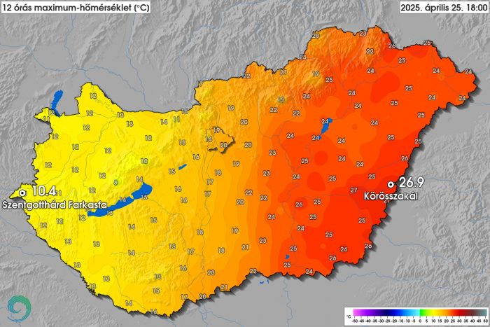Az elemzés szerint a borongós, tartósabban csapadékos, Vas vármegyei Szentgotthárdon pénteken 10,4 Celsius-fok volt a legmelegebb órákban, míg a naposabb, Hajdú-Bihar vármegyei Körösszakálon 26,9 fokot mértek, vagyis csaknem 17 fokos eltérés volt a két település csúcshőmérséklete között.