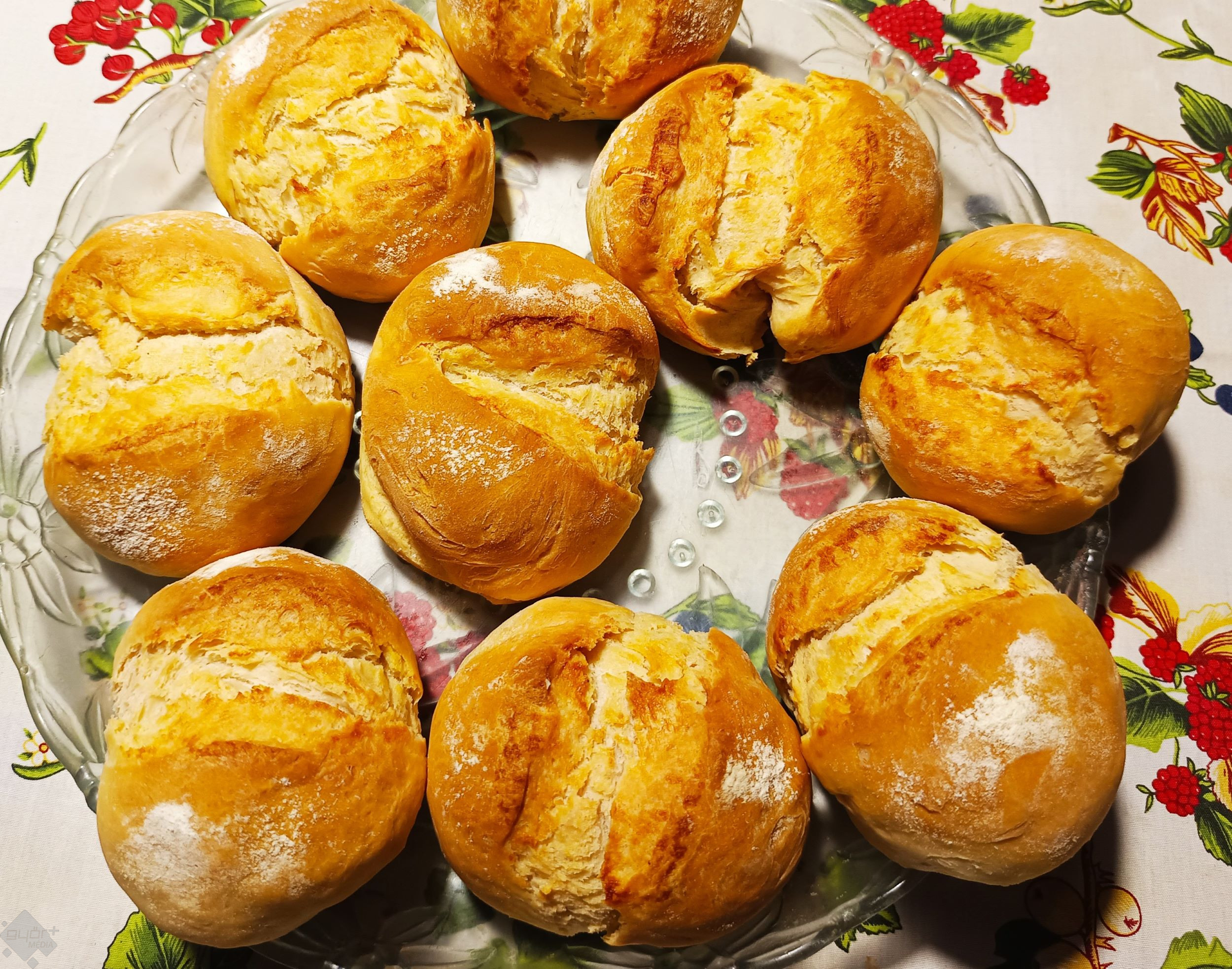 A tejet a vízzel, a száraz élesztővel és a cukorral összekeverjük. Belecsorgatjuk az olvasztott vajat. A lisztet átszitáljuk, megsózzuk, majd az egészet közepesen puha masszává gyúrjuk. Egy olajjal kikent tálban 50 percig kelesztjük. Még egyszer átgyúrjuk és kilenc részre osztjuk. Kis cipókat formázunk belőle. Sütőpapírral bélelt tepsire rakjuk, 20 percig letakarva pihentetjük. A tetejére kevés lisztet szitálunk, de ezt el is hagyhatjuk. Éles késsel a tetejét bevágjuk, majd a résbe vékony vajszeleteket teszünk. A sütőt előmelegítjük és 200 fokon 25 percig sütjük.