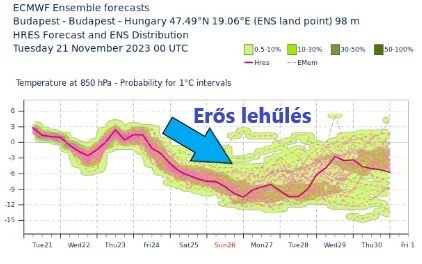 Az ECMWF modell 850 hPa-os (kb. 1500 méteres magasság) hőmérsékletre vonatkozó valószínűségi előrejelzésén is jól látszik a hétvégén érkező erős lehűlés: