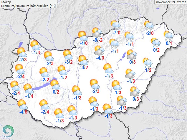 A hajnali -8, +1 fokról -2 és +5 fok közé emelkedik a hőmérséklet. Az északkeleti havas részeken mérhetjük az alacsonyabb értékeket – olvasható az Országos Meteorológiai Szolgálat honlapján.